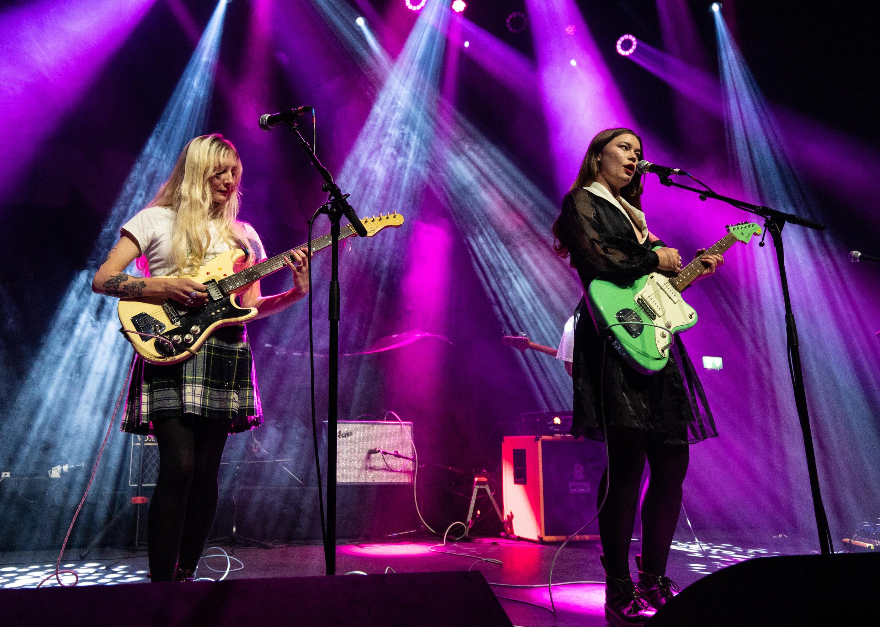 Taylor Skye and Georgia Ellery of Jockstrap performing at Islington Assembly Hall on October 27, 2021, in London, England.