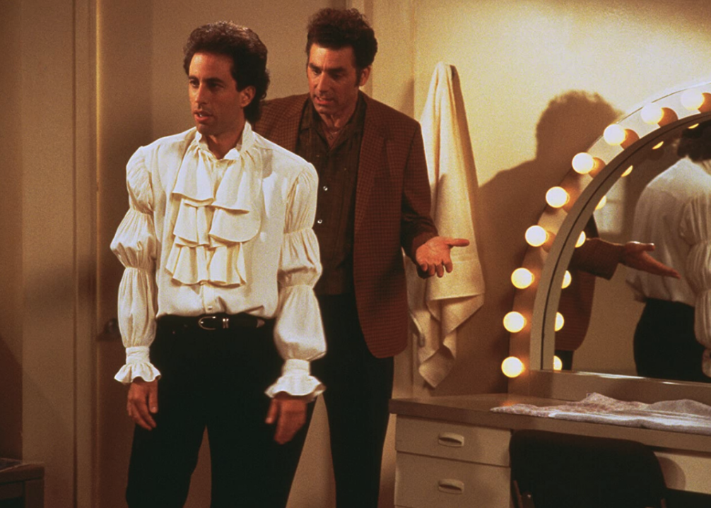 Jerry wearing a ruffled shirt with Kramer behind him.
