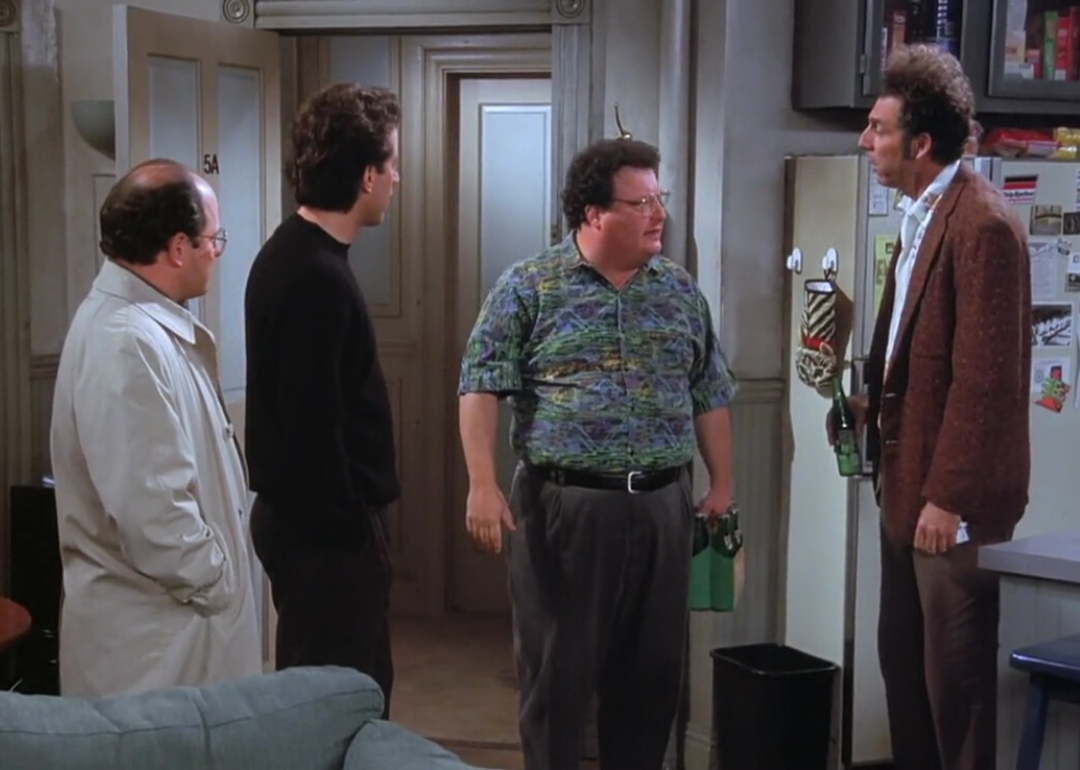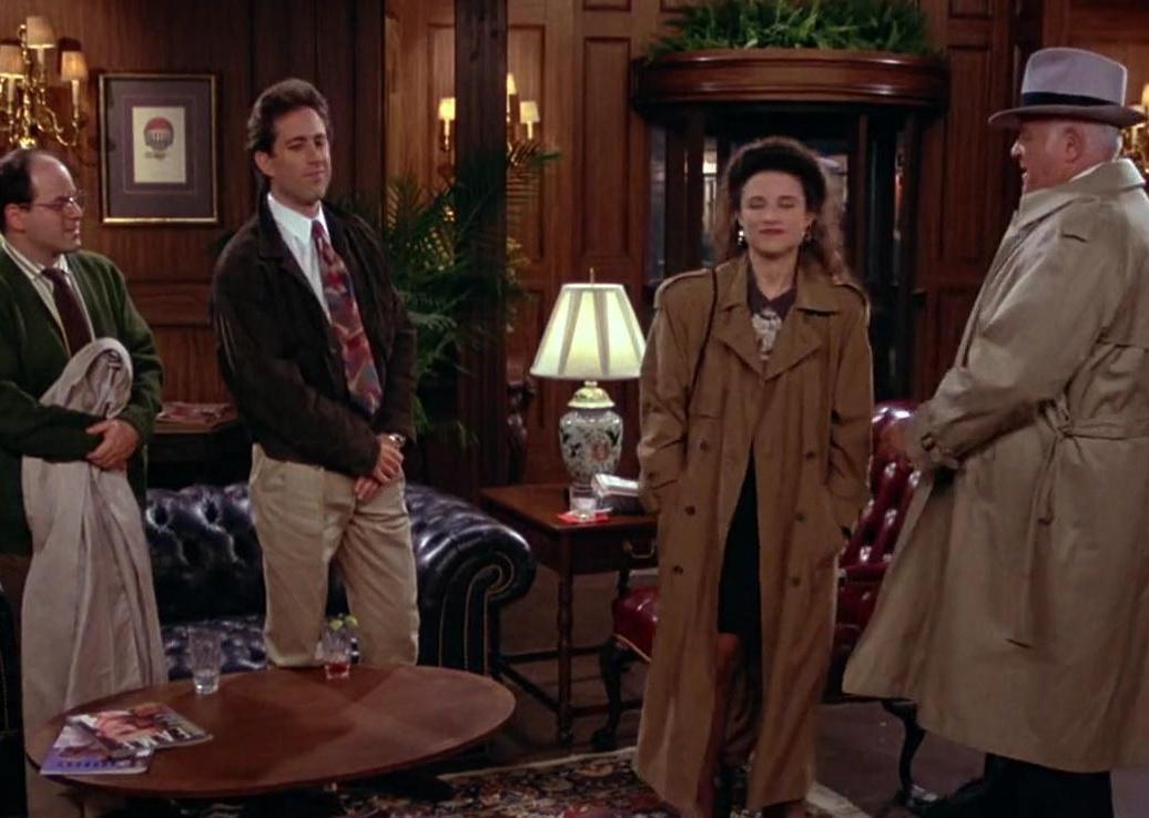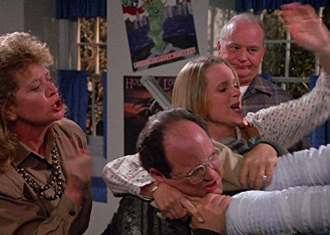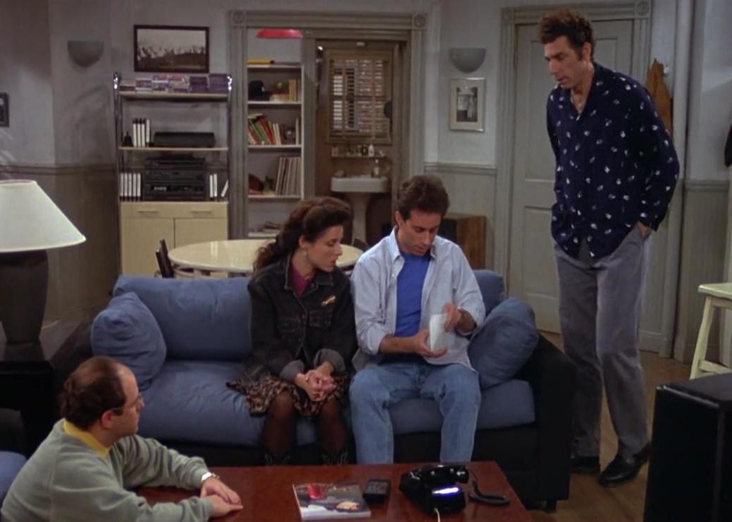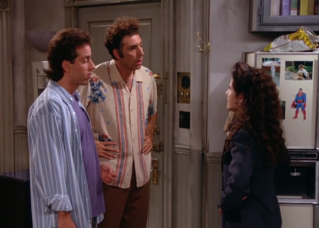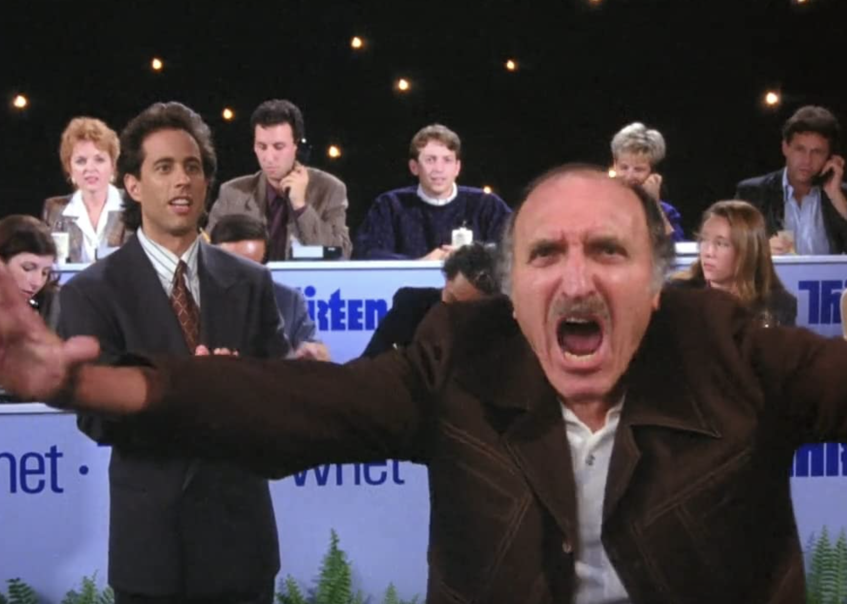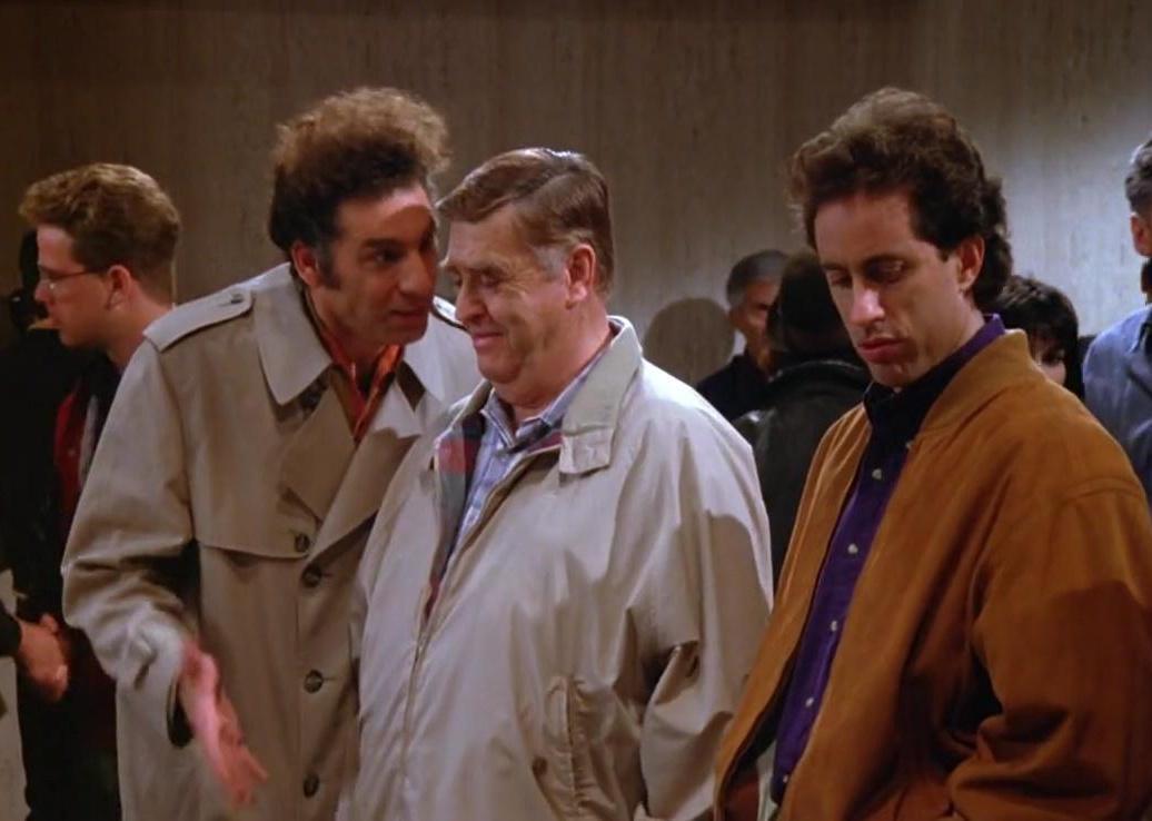 Everyone is supposed to be watching the big fight at Jerry’s apartment. Instead, all eyes are focused on a different kind of fight going down curbside. Specifically, George and a man named Mike Moffitt (played by Lee Arenberg) bicker over the rights to a parking spot, since one man was backing into the spot while the other was sliding in front-first. Every onlooker—including two police officers—take sides in the dispute, which was inspired by an incident that happened to writer Greg Daniels’ father.
