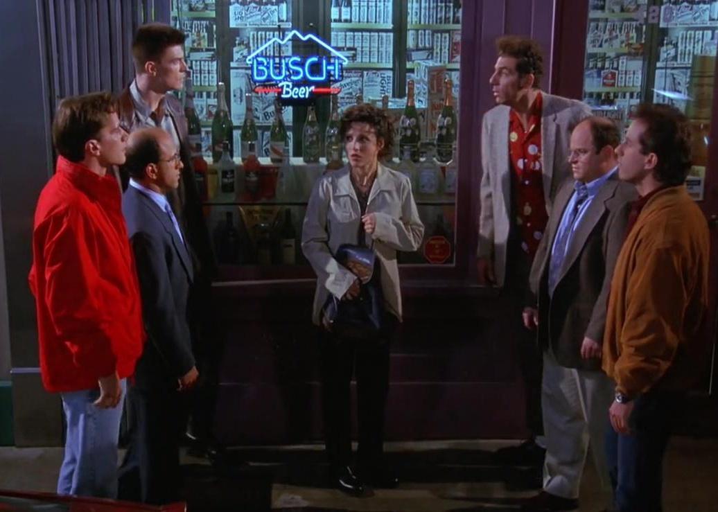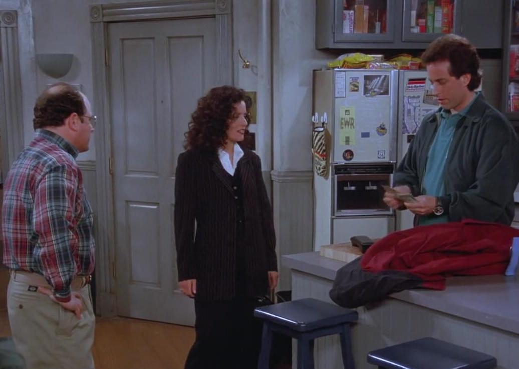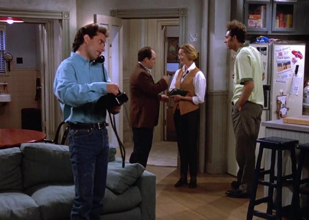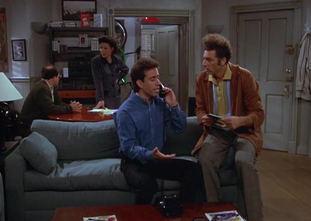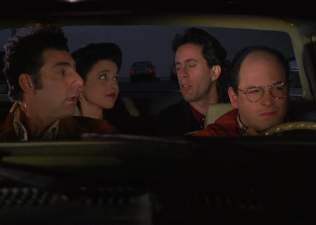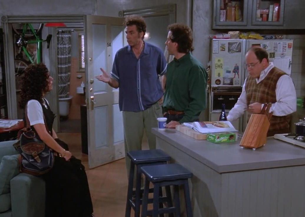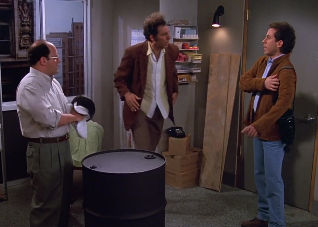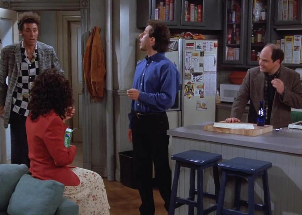 Everyone is supposed to be watching the big fight at Jerry’s apartment. Instead, all eyes are focused on a different kind of fight going down curbside. Specifically, George and a man named Mike Moffitt (played by Lee Arenberg) bicker over the rights to a parking spot, since one man was backing into the spot while the other was sliding in front-first. Every onlooker—including two police officers—take sides in the dispute, which was inspired by an incident that happened to writer Greg Daniels’ father.