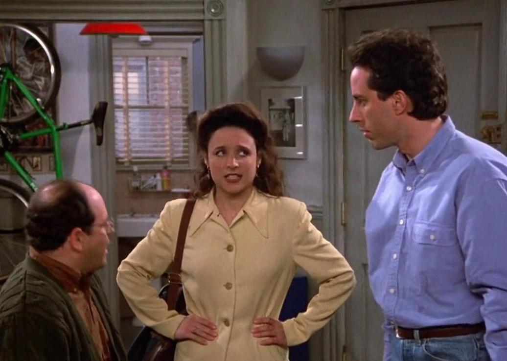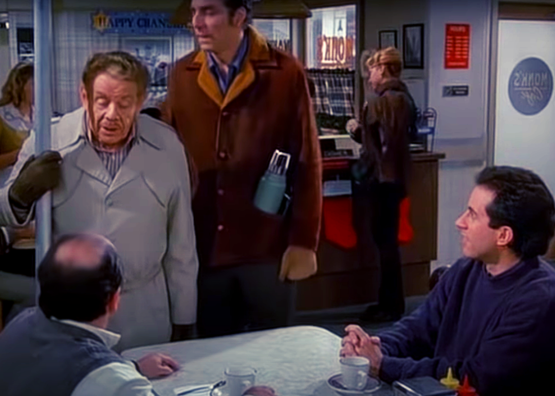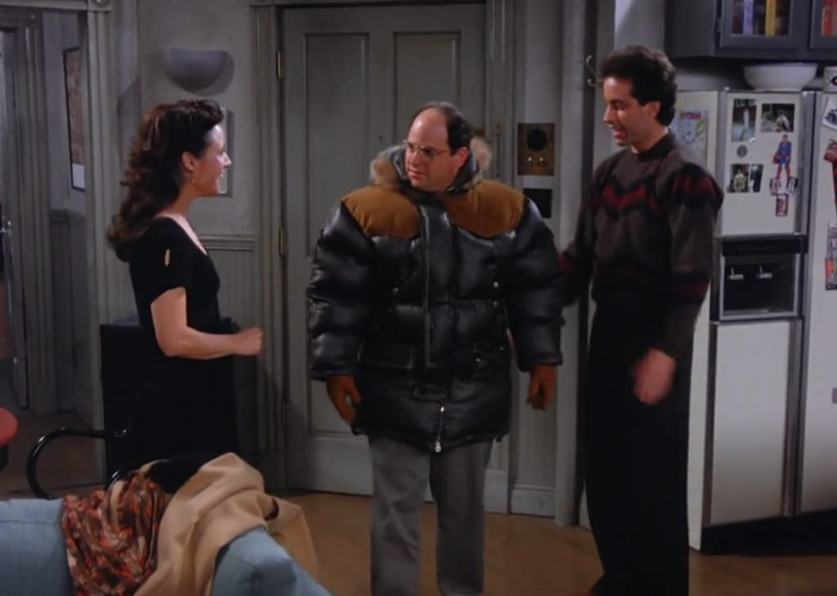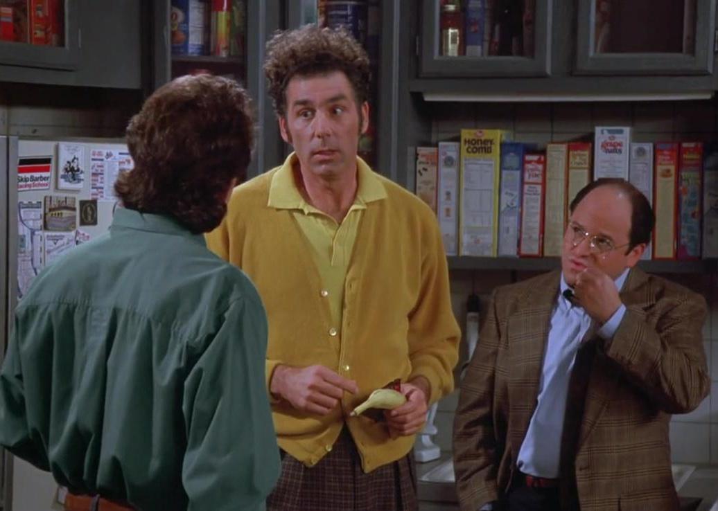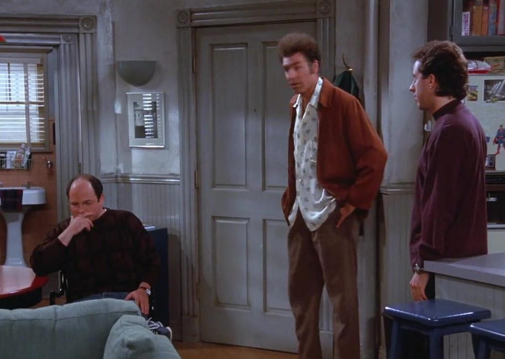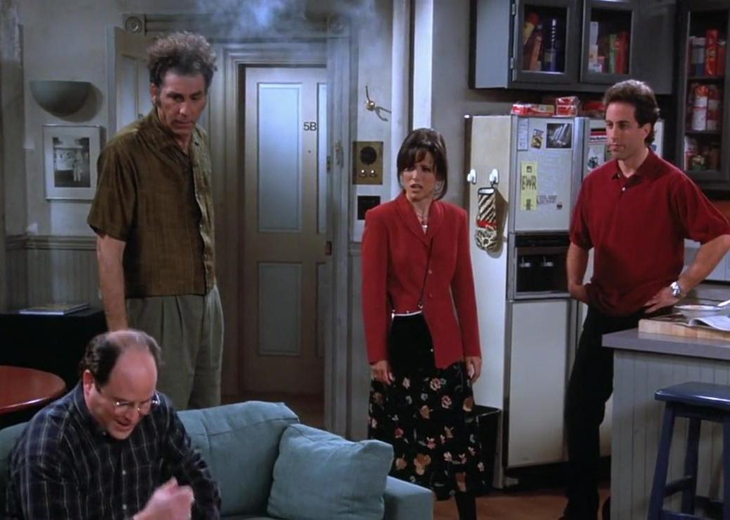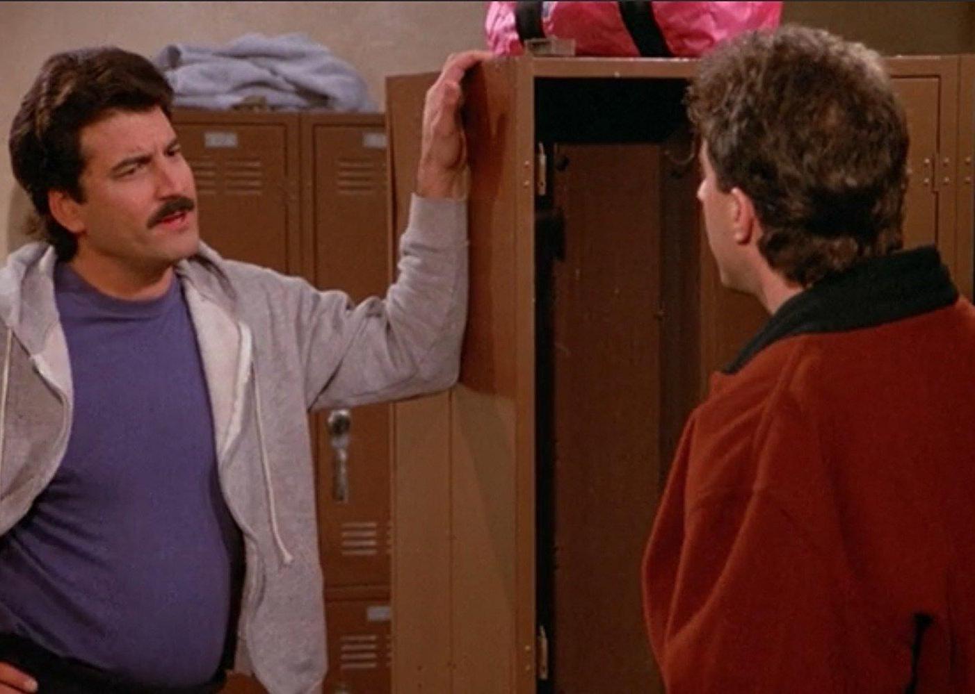 Everyone is supposed to be watching the big fight at Jerry’s apartment. Instead, all eyes are focused on a different kind of fight going down curbside. Specifically, George and a man named Mike Moffitt (played by Lee Arenberg) bicker over the rights to a parking spot, since one man was backing into the spot while the other was sliding in front-first. Every onlooker—including two police officers—take sides in the dispute, which was inspired by an incident that happened to writer Greg Daniels’ father.