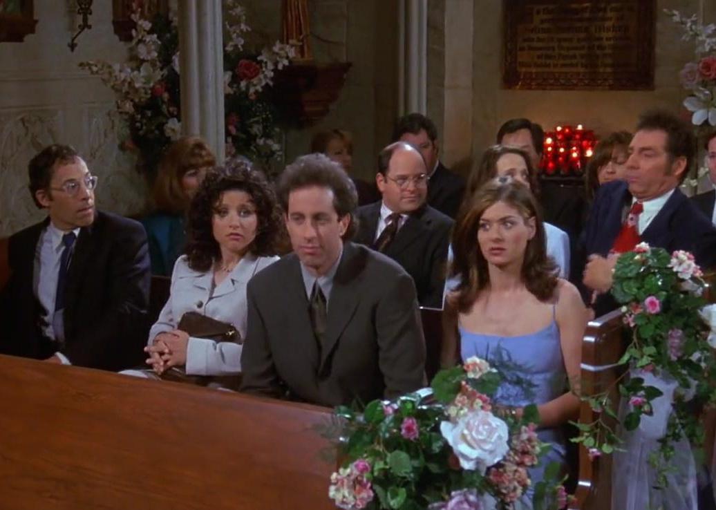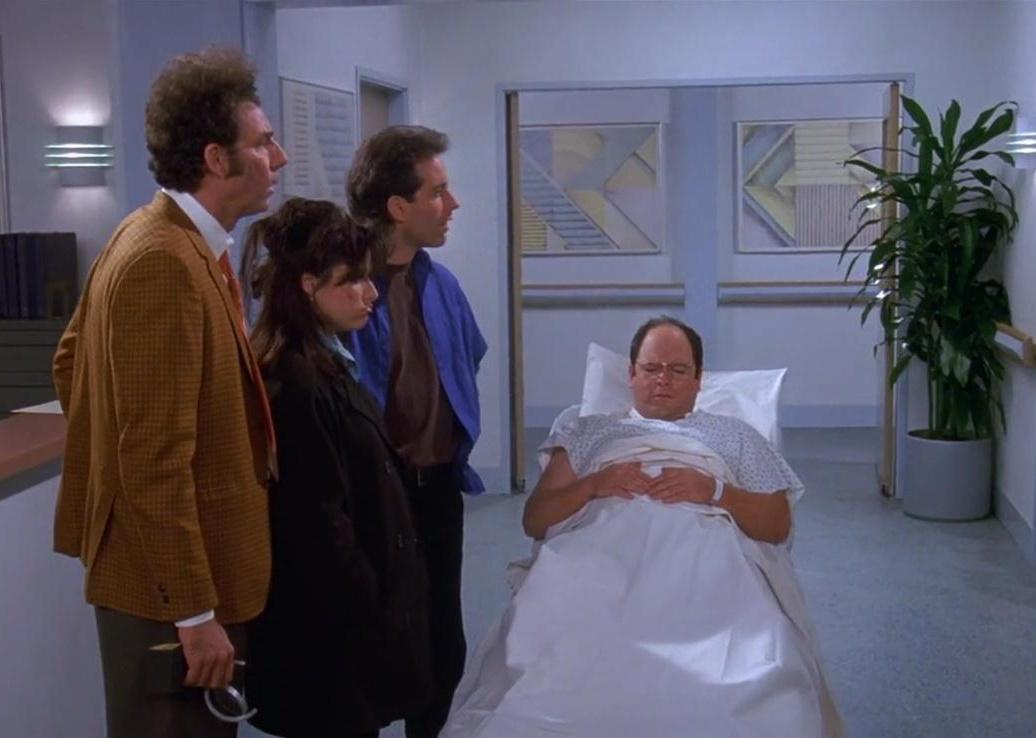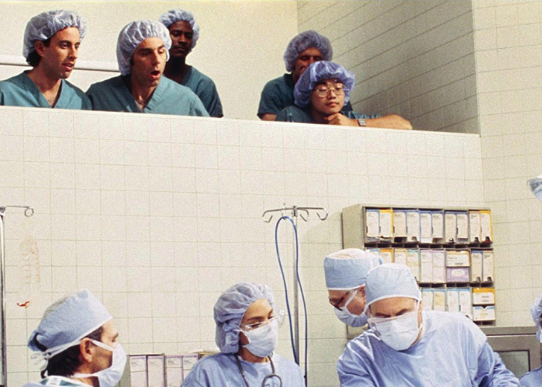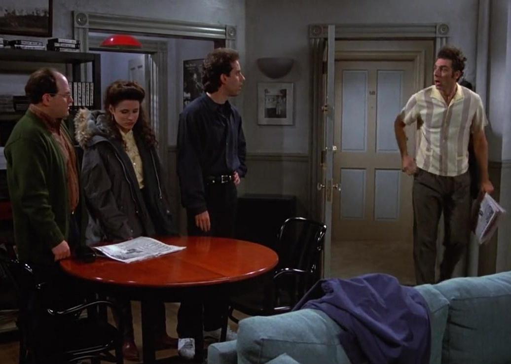 George learns the value of leaving the room on a comedic high note. Elsewhere, Kramer and his friend Mickey Abbott (played by Danny Woodburn) fight over roles while acting out diseases for medical students. Speaking of diseases, Jerry’s girlfriend of the week believes she once contracted an STD after riding a tractor. Meanwhile, Elaine suffers deep disappointment upon discovering that Puddy is religious.