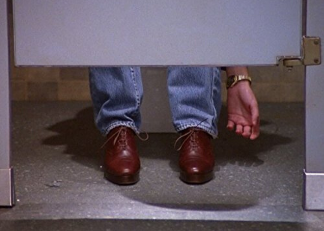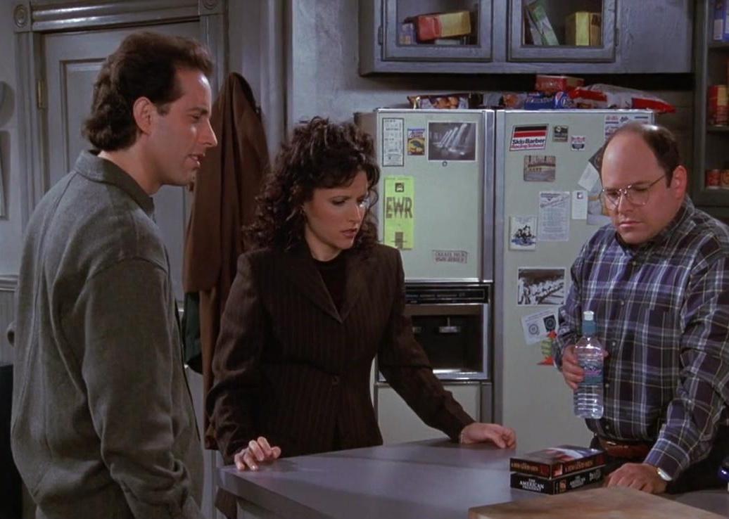 By the seventh season, any given episode of “Seinfeld” was straddling multiple storylines at once—”The Wait Out” is no exception. The episode begins with George’s off-hand comment—”You can do a lot better than him!”—to a recurring character who’s about to get married, prompting her to reconsider the engagement. Meanwhile, Kramer struggles to fit into a pair of jeans, invariably leading to at least two different situational mishaps.