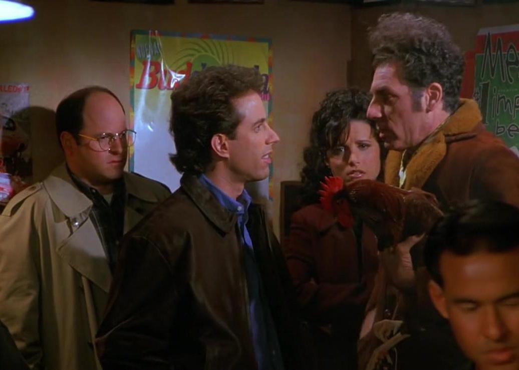 Jerry bounces a clown-themed check at the local deli, which is then displayed for all to see. The only way Jerry can get his dignity back is if Kramer’s new rooster, “Little Jerry,” purposely loses its next fight. As if that weren’t ridiculous enough, George chances upon the stuff of his wildest fantasies after striking up a sexual relationship with a female prison inmate.