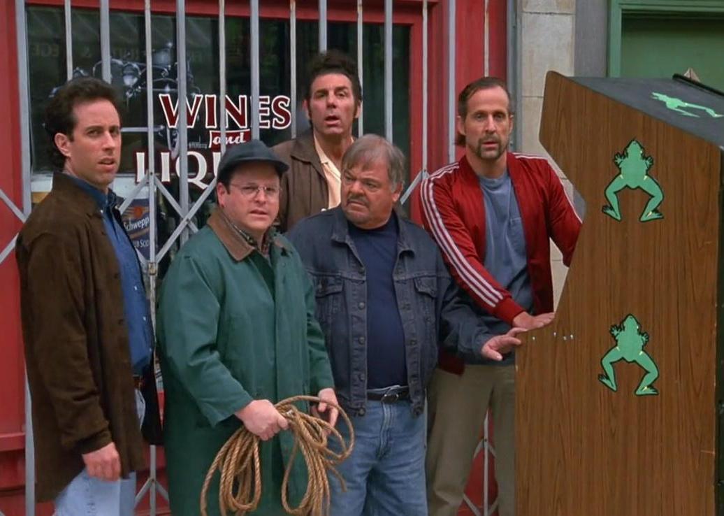Presenting a monologue for the ages is this episode, in which George pretends to be a marine biologist to impress a woman he’s dating. The ruse is going well enough until the two come upon a beached whale with breathing problems, whom only a marine biologist can save. As George explains in the historic closing monologue, the sea was angry that day, “like an old man trying to send soup back at a deli.” After a wave launches him atop the whale’s back, George reaches into the blowhole to withdraw the obstruction: one of Kramer’s golf balls.