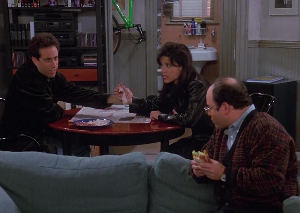 This is also the episode that brought us the term “high-talker” (referring to Elaine’s friend’s high-pitched voice) and introduced us to the concept that class equates with eating a Snickers bar with a knife and fork (à la Elaine’s boss, Mr. Pitt).