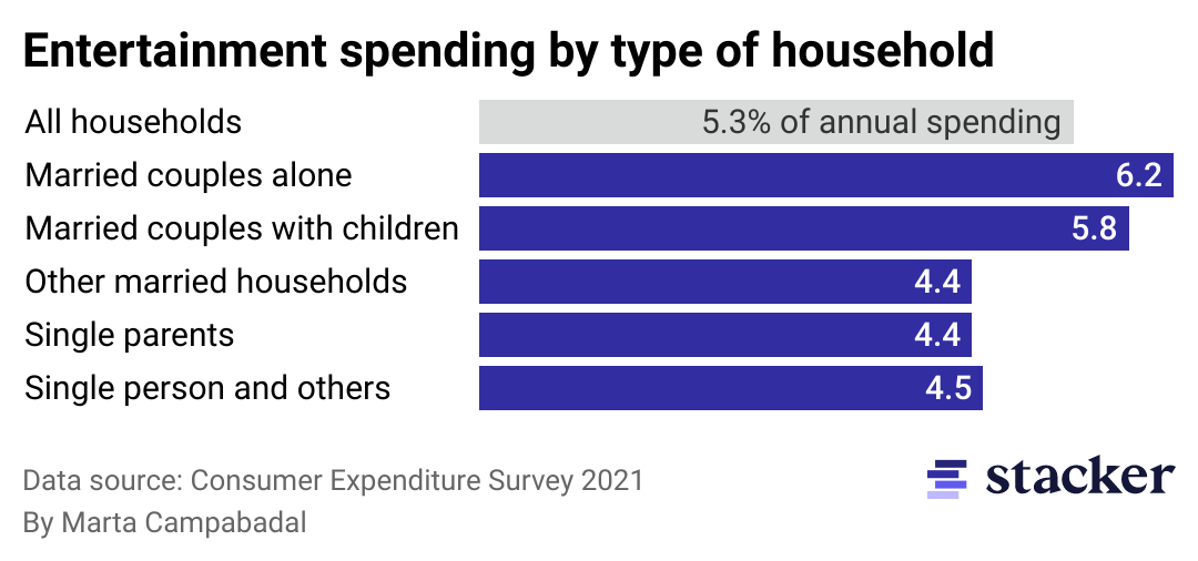 In the pandemic, married couples without children spent the most on entertainment, using 6.2% of their household budget. A lack of child care expenses means an influx of joint discretionary income and leisure time to enjoy it. The survey did reveal that married couples with children weren’t too far behind, spending 5.8% of their household income on entertainment.