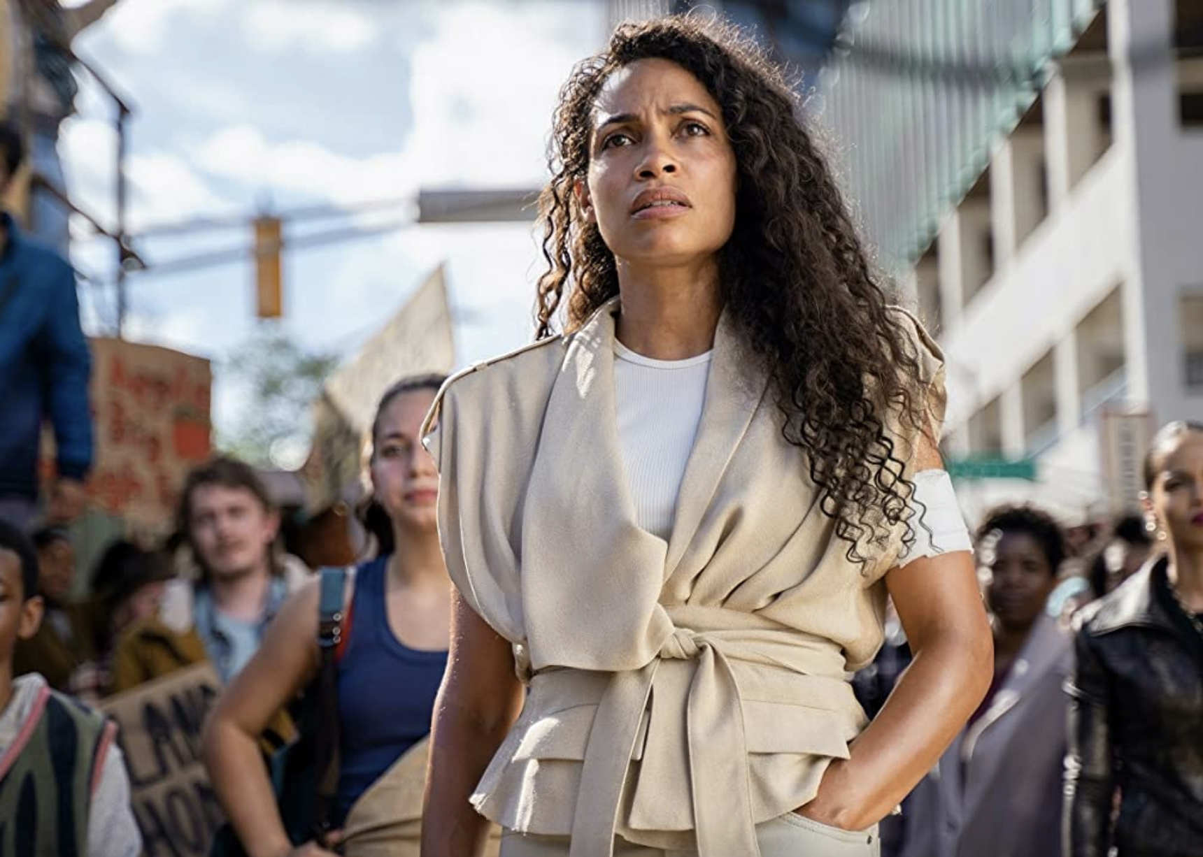 “DMZ” is a dystopian miniseries based on the comic book series of the same name. Set in the not-so-distant future, the show takes place in the midst of the Second American Civil War and stars Rosario Dawson as Alma Ortega, a New York City medic who becomes a symbol of hope for her determination to find her son eight years after he left her side during the evacuation of Manhattan. The series also marks award-winning filmmaker Ava DuVernay’s directorial debut with DC Comics.
