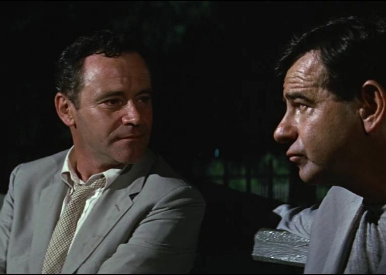 Jack Lemmon and Walter Matthau in suits on a park bench at night.