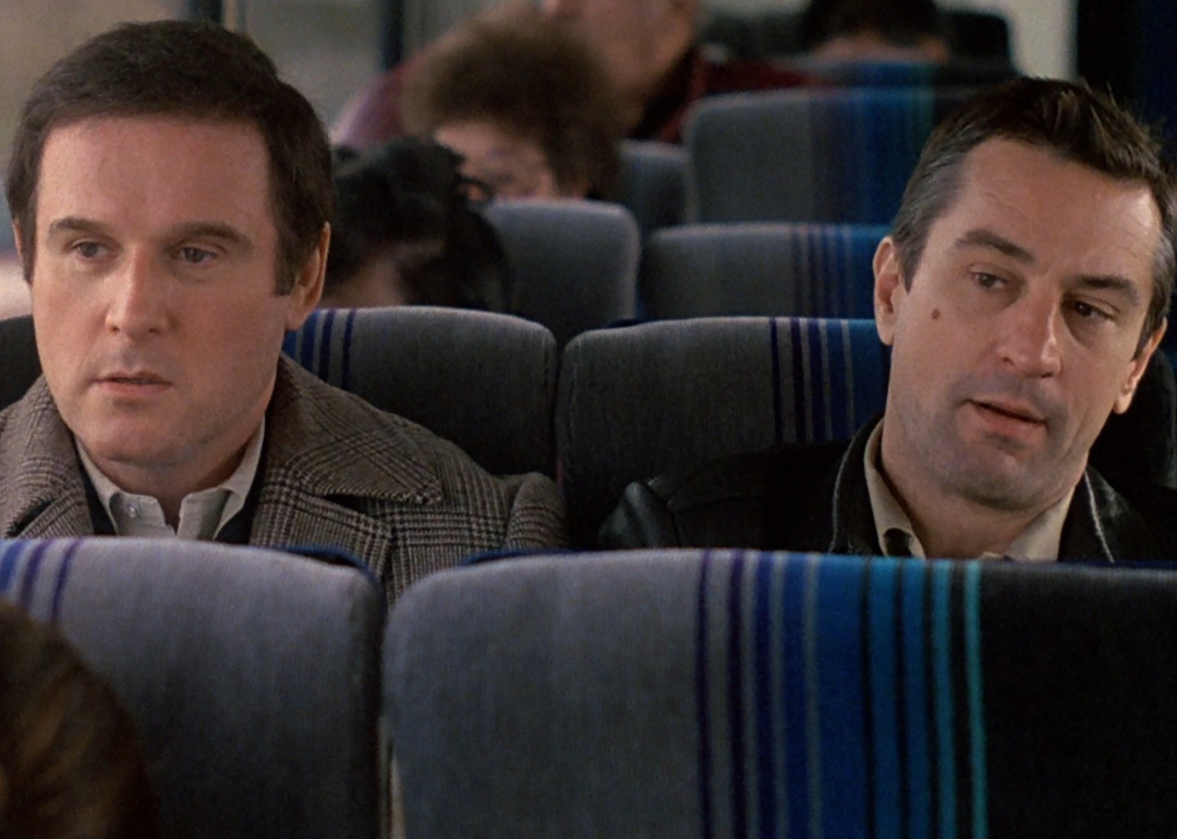 Robert DeNiro and Charles Grodin sitting on a bus together.
