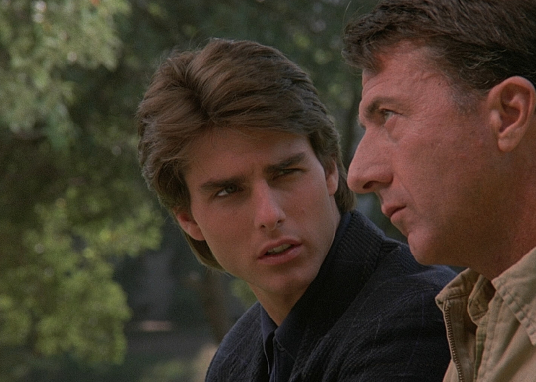 Tom Cruise stares at Dustin Hoffman, as he stares off into the distance.