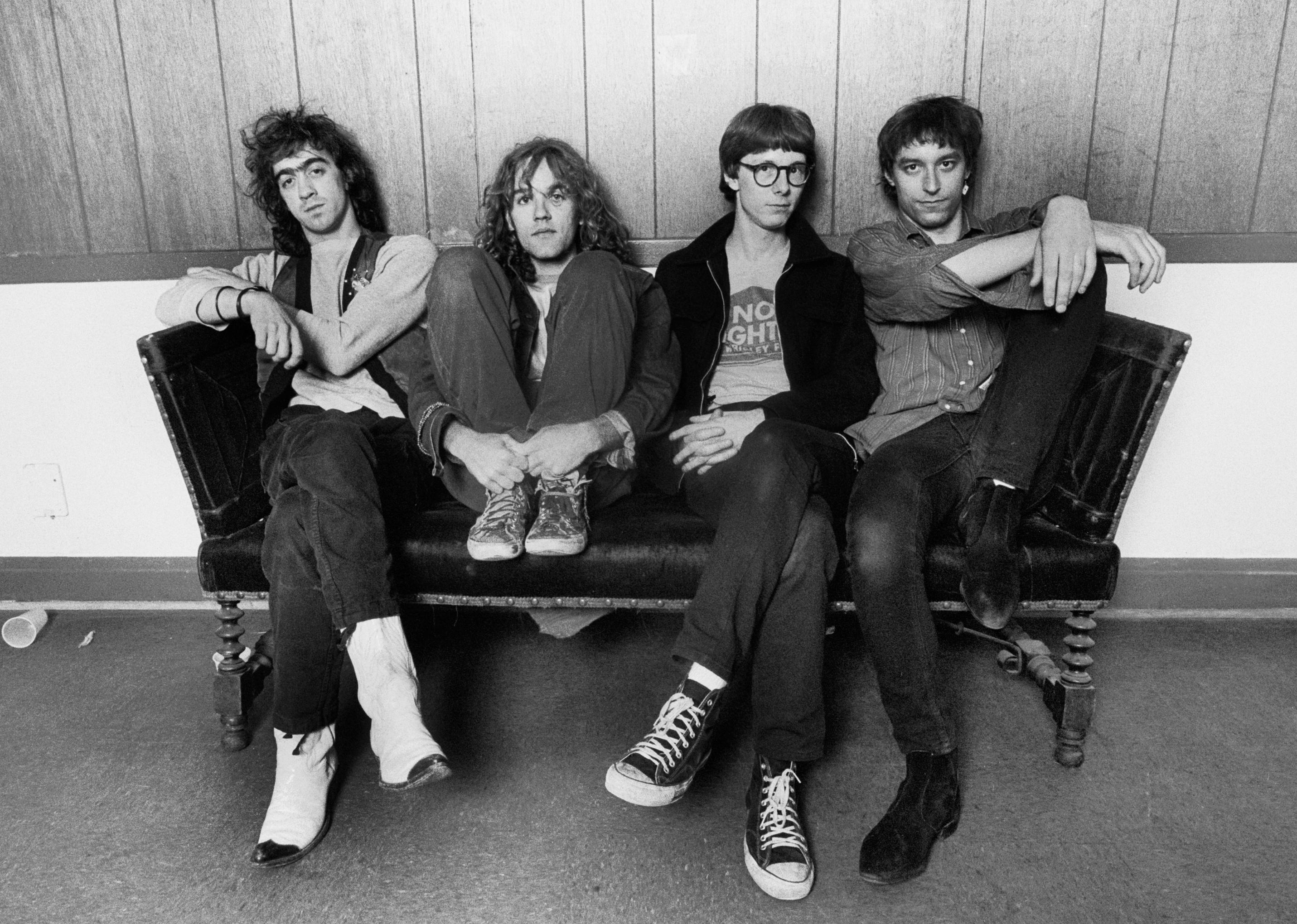 Portrait of the band REM, left to right, Bill Berry, Michael Stipe, Mike Mills and Peter Buck.