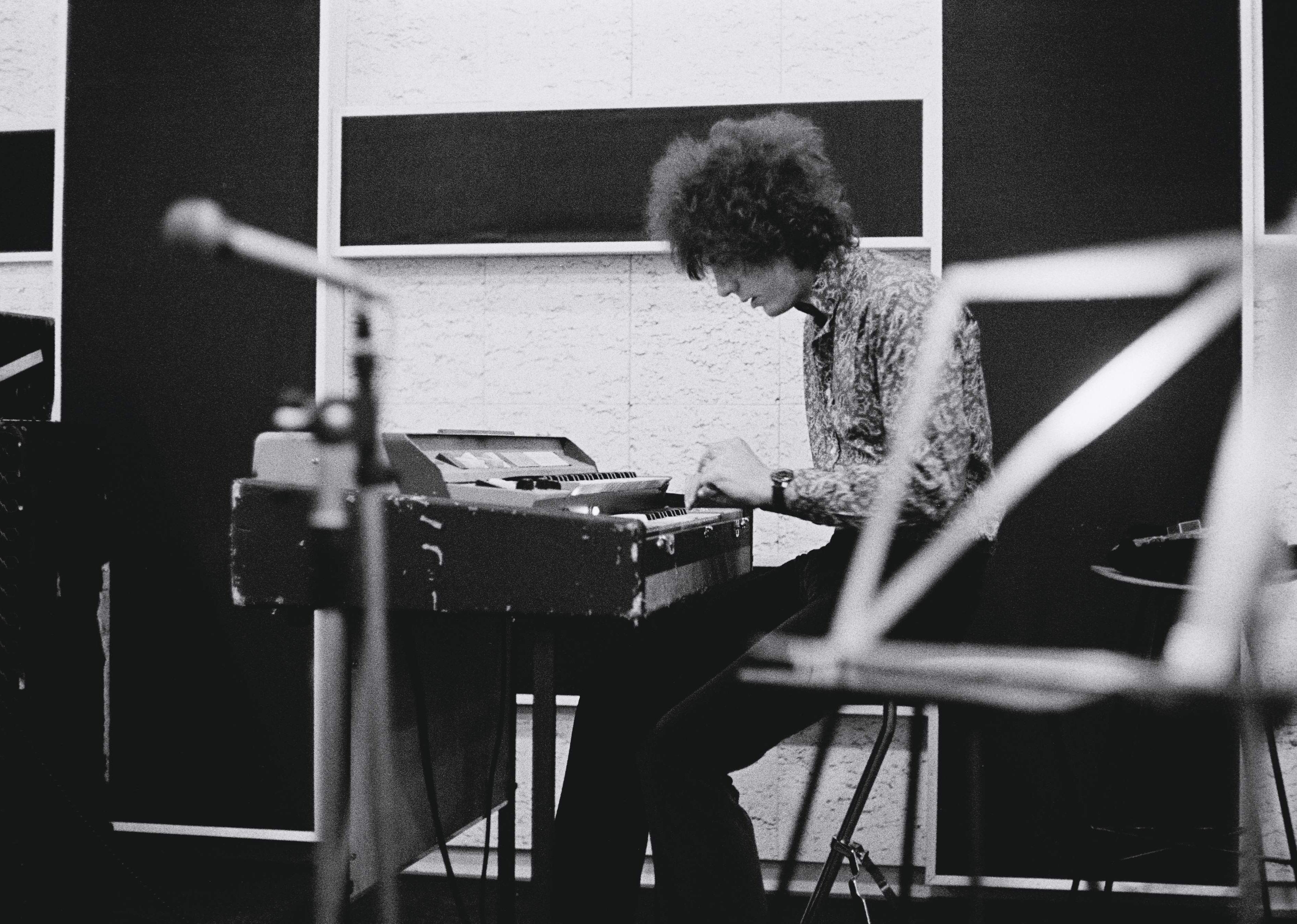Syd Barrett playing keyboards in a recording studio.
