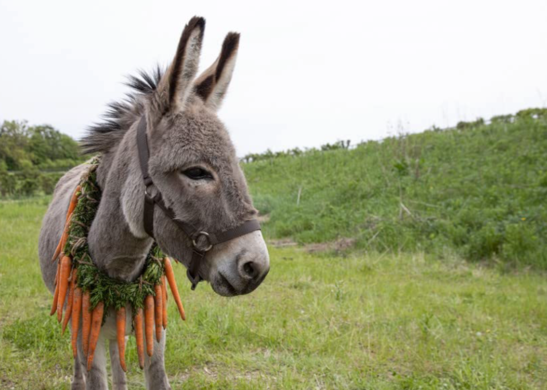 Donkey with carrots around neck in ‘EO’.