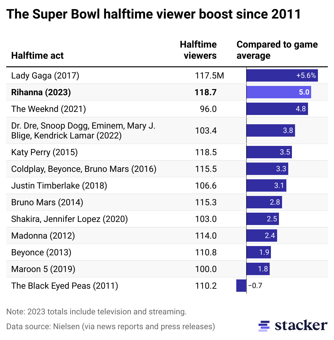 Calculated this way, Rihanna’s show still dominates. Her halftime performance drew in 5% more viewers than the Kansas City Chiefs and Philadelphia Eagles averaged throughout the game. That is the second-highest figure since the earliest data available in 2011, trailing only the 5.6% bump Lady Gaga scored in 2015.