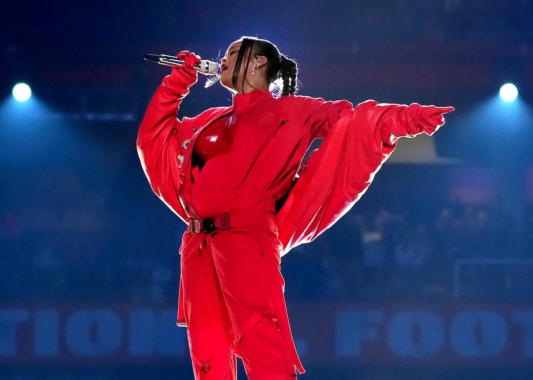 Rihanna performing halftime show in all-red outfit at Super Bowl LVII.