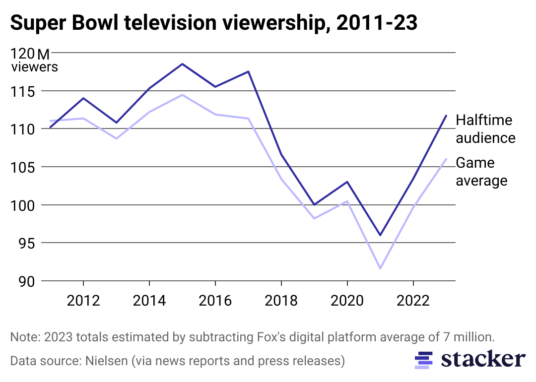 Of course, those are linear television figures, which don’t capture streaming totals. Streaming has been steadily on the rise since the New York Giants’ second victory over the Patriots in 2012 became the first Super Bowl with an online streaming option. This year reached a new high with an average of 7 million streams. However, past streaming totals don’t capture the halftime show’s viewership for earlier Super Bowls. This data also doesn’t factor in co-viewing from multiple devices.