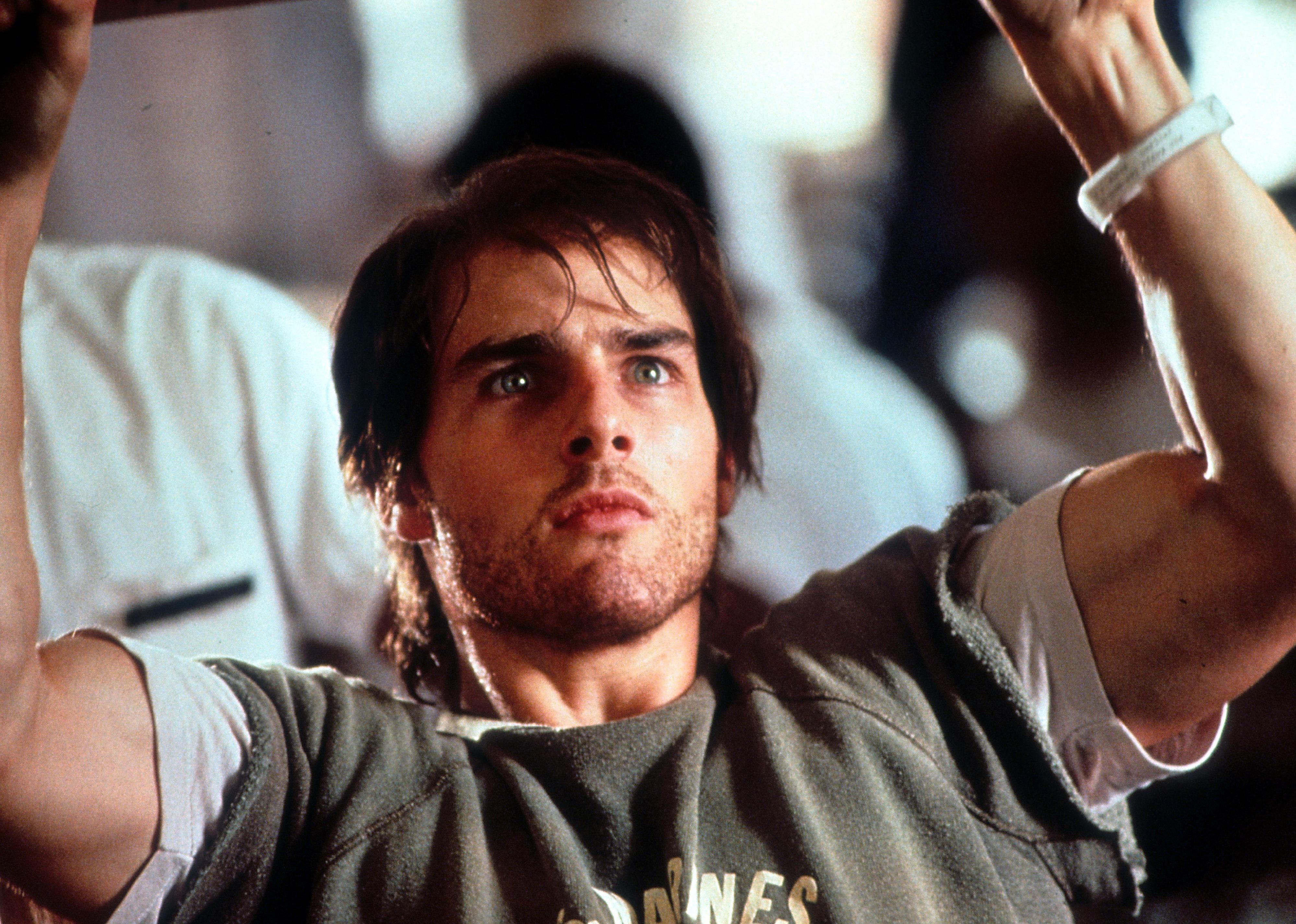 Tom Cruise in a Marines cut off sweatshirt doing chin ups.