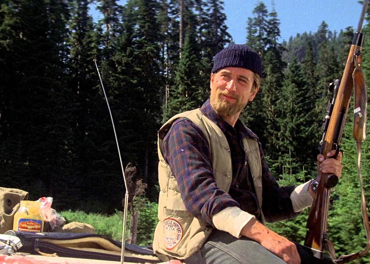 Robert De Niro in a plaid shirt, vest and beanie sitting on the hood of a car holding a rifle.