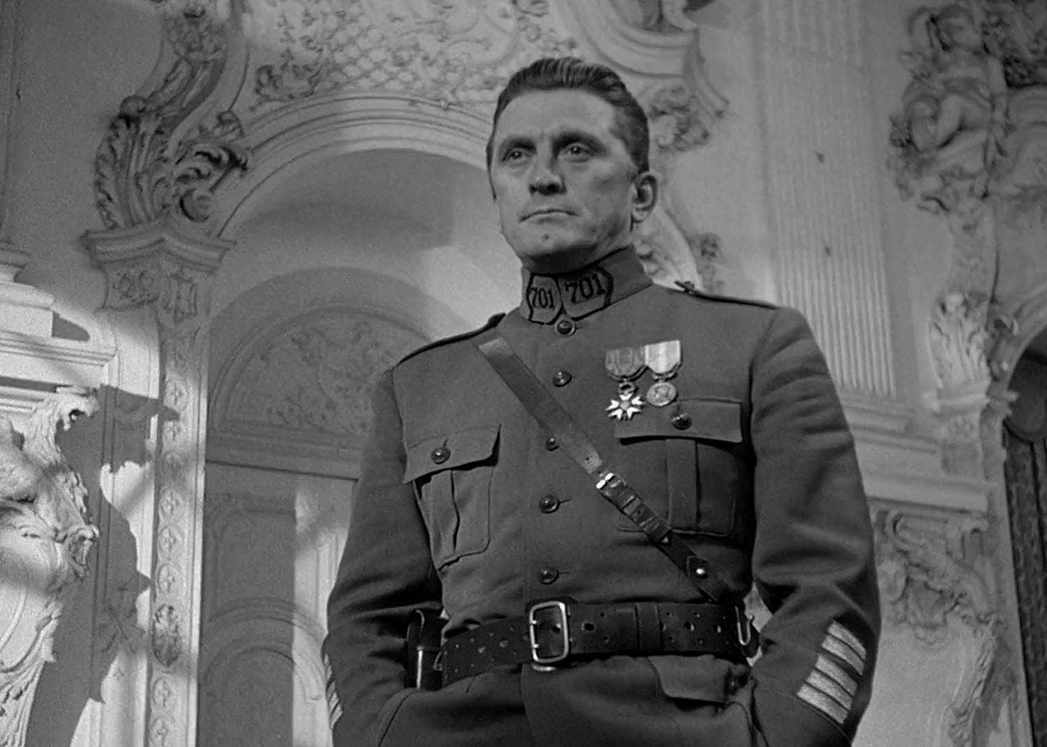 Kirk Douglas in a military uniform in a beautiful ornate historic room.