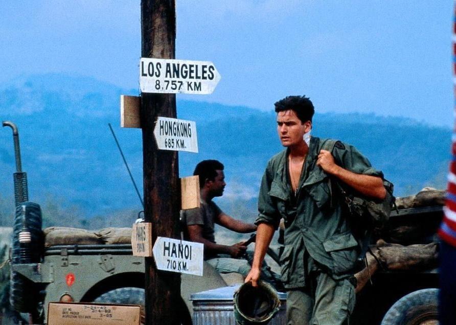 Charlie Sheen in military gear walking past a sign pointing to various cities with a military jeep in the background.