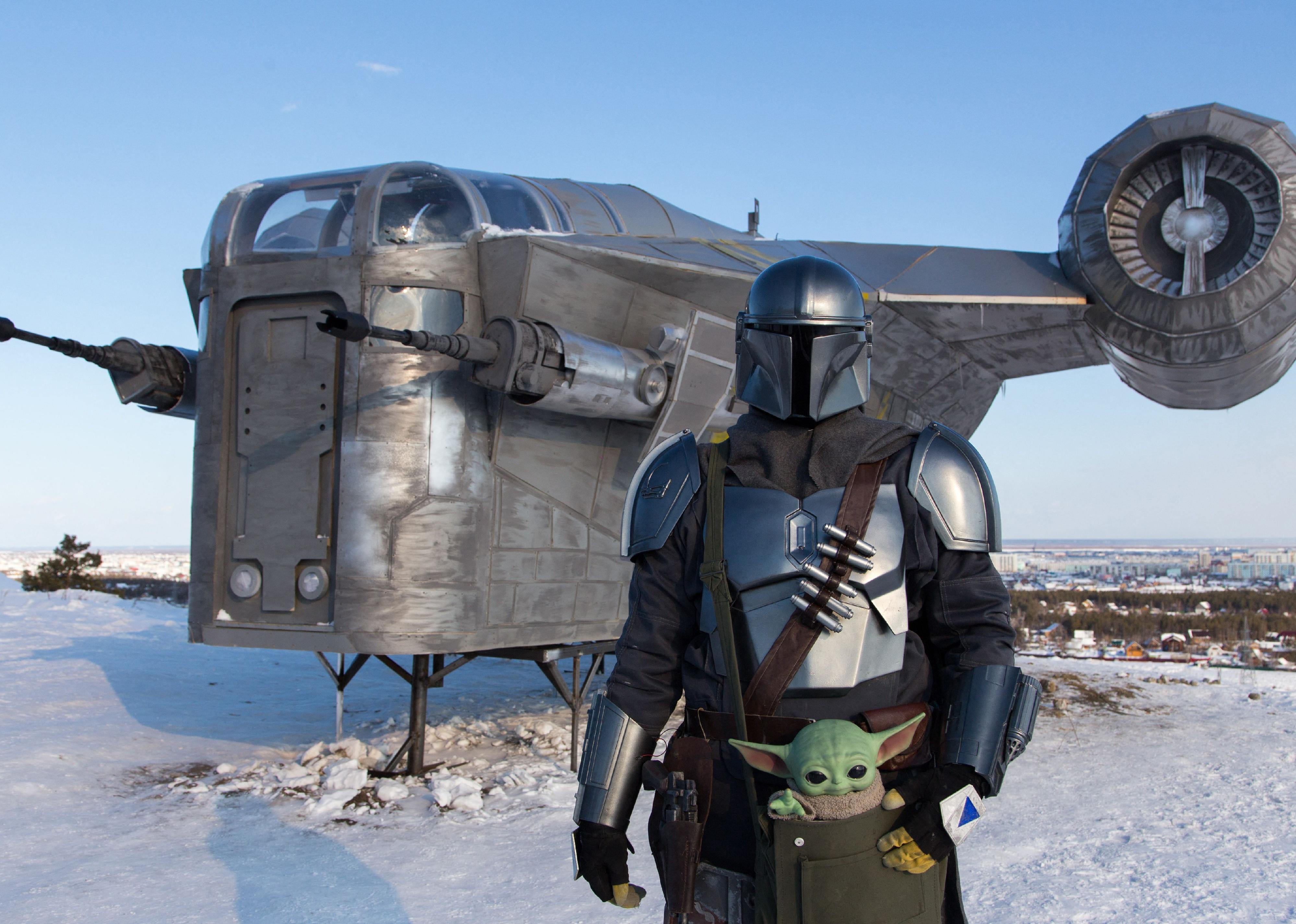 A man wearing a costume of Din Djarin poses in front of a giant replica of the Razor Crest.