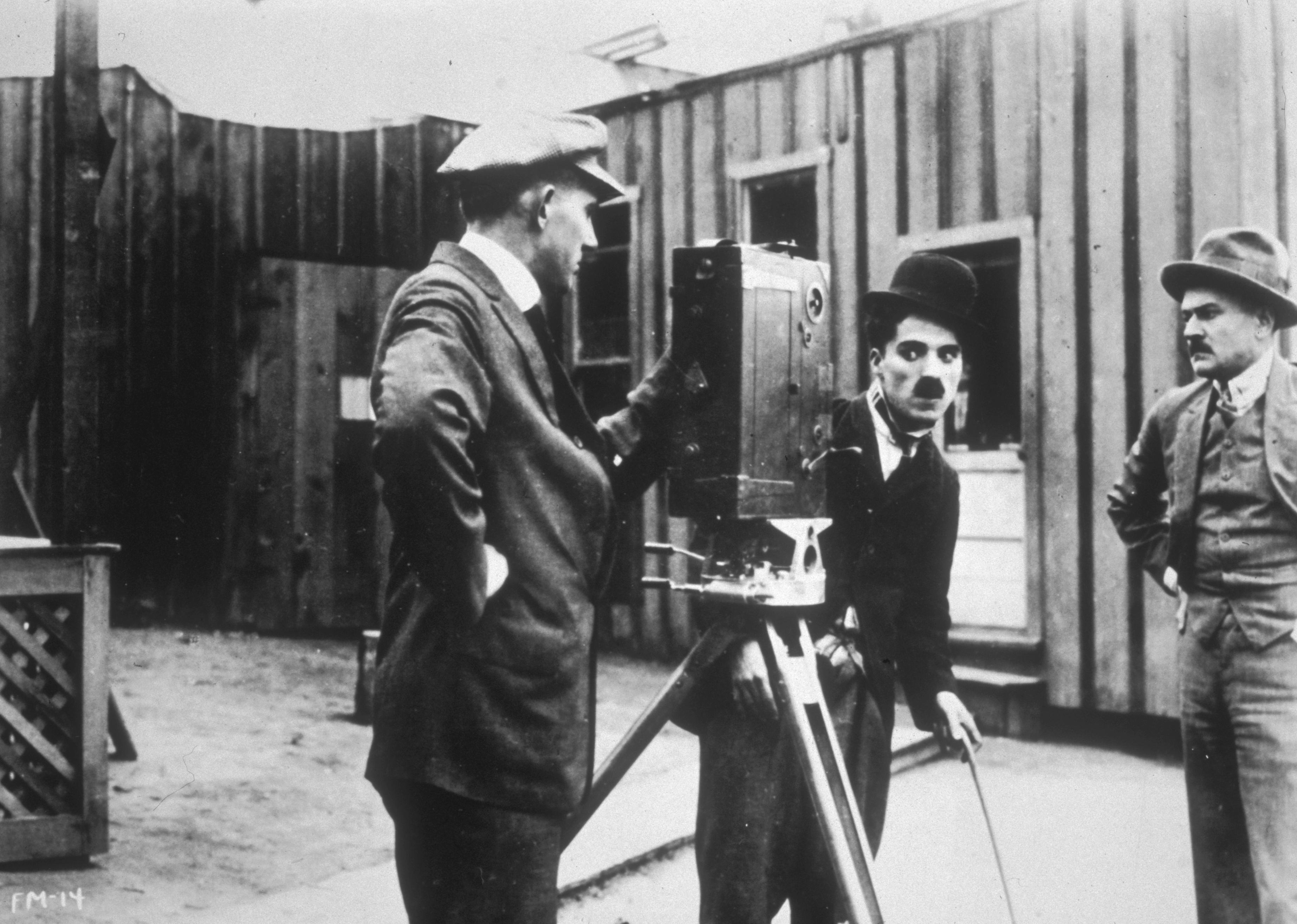 Charles Chaplin in costume as the Tramp, looks into a movie camera as two cameramen stand by.