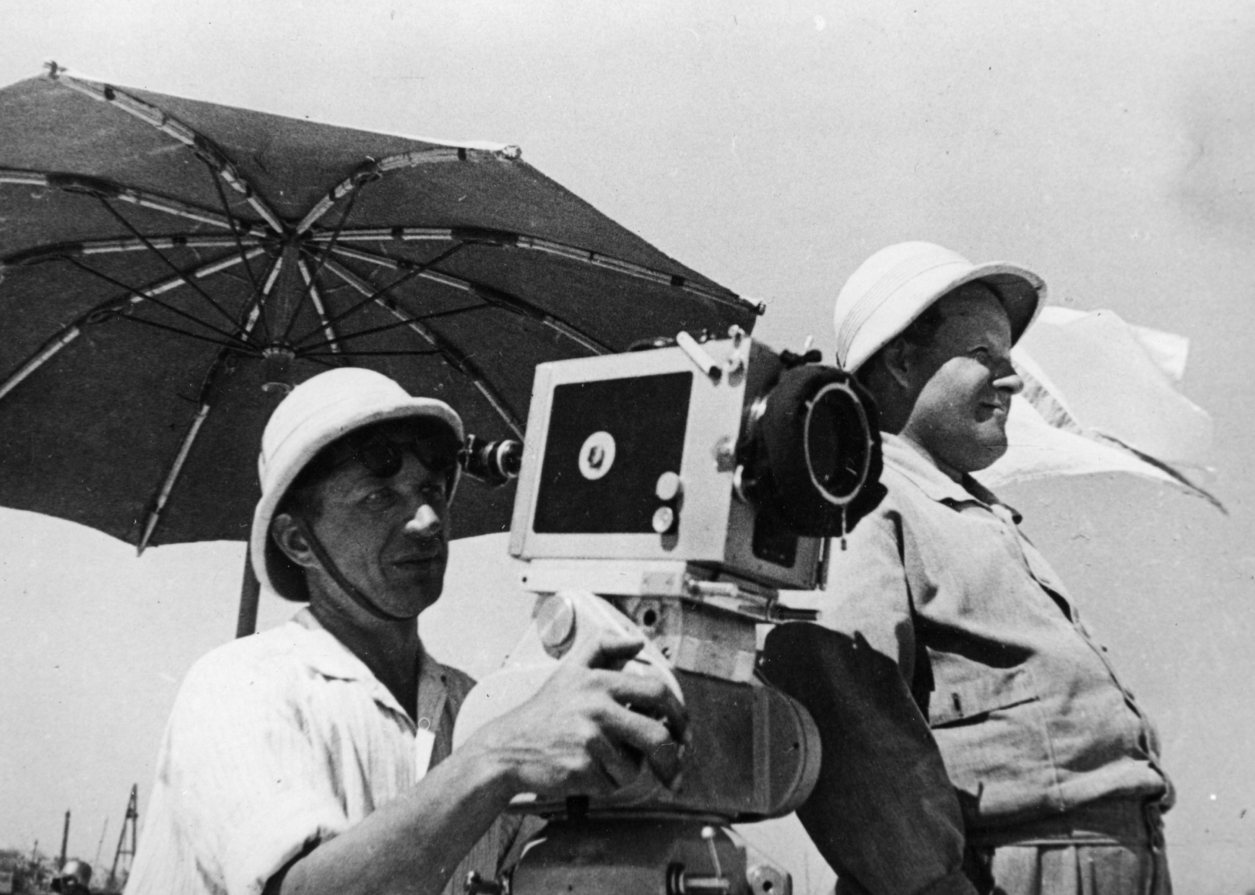 Sergei Eisenstein and his cinematographer E. Tisse shooting on location.