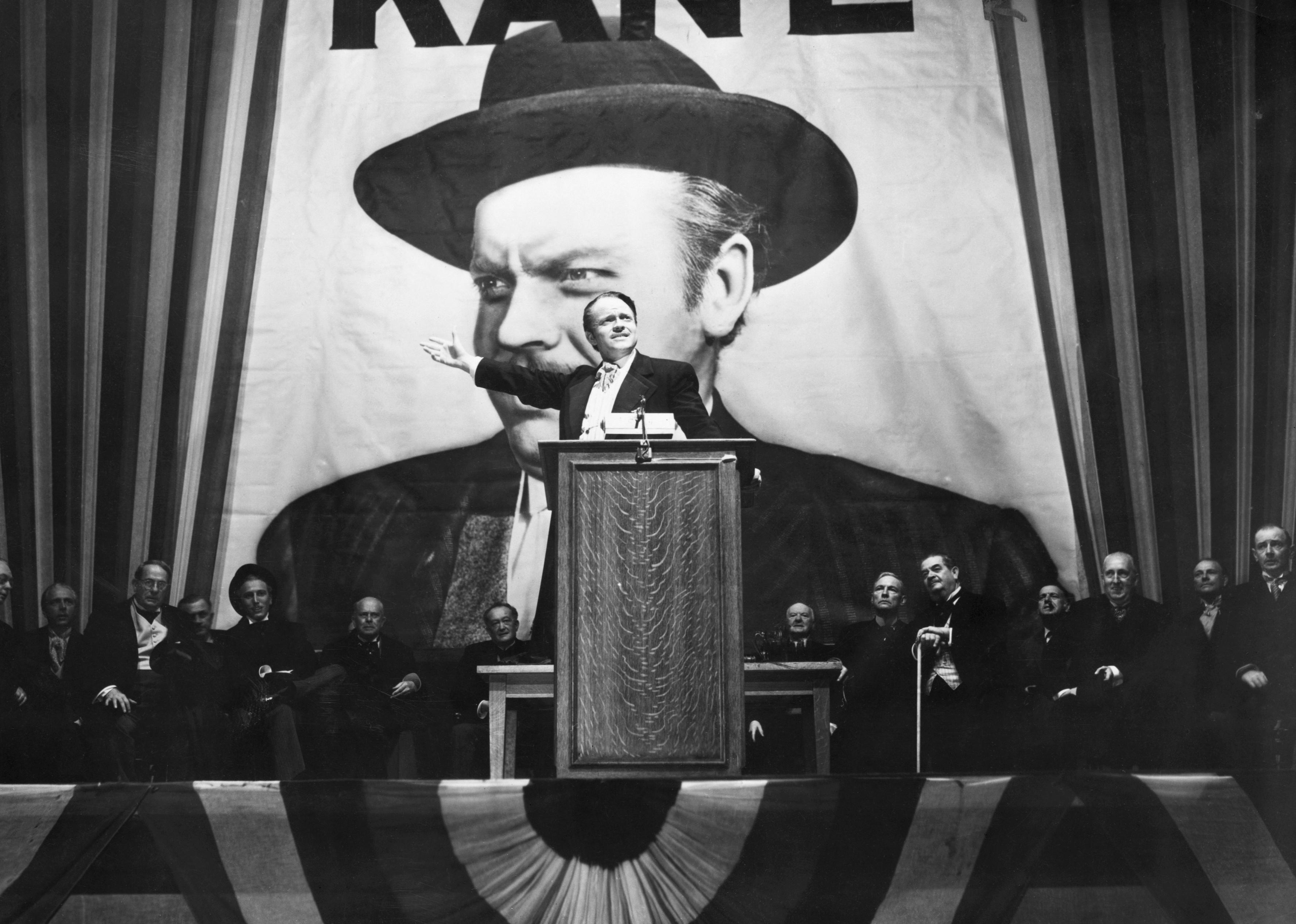 Orson Welles makes a speech before a portrait of himself in a scene from Citizen Kane.