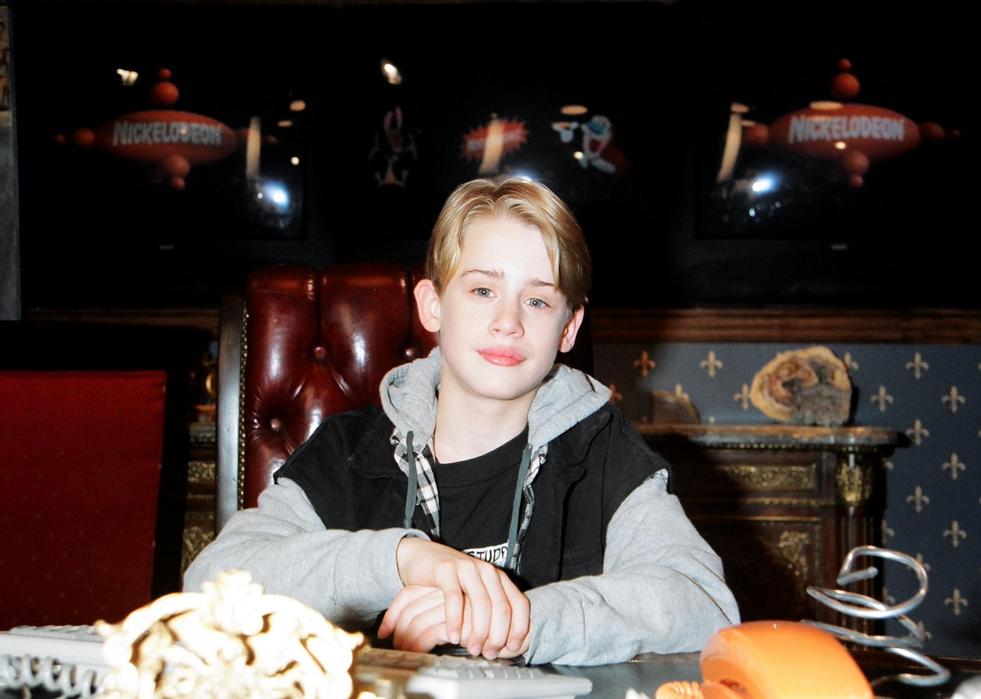 Young Macaulay Culkin sitting at a table at a Nickelodeon event.