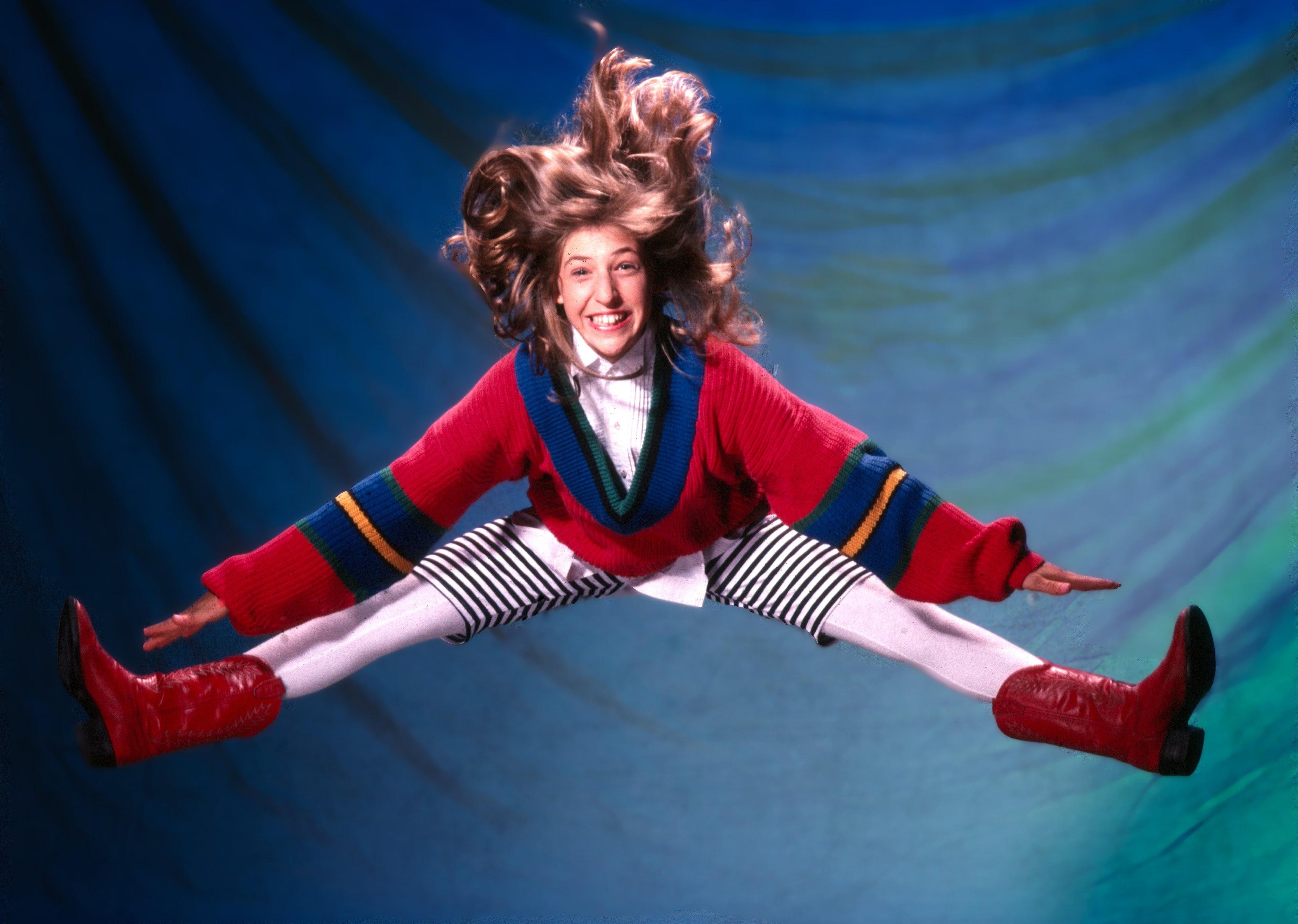 Mayim Bialik jumping in the air and smiling.