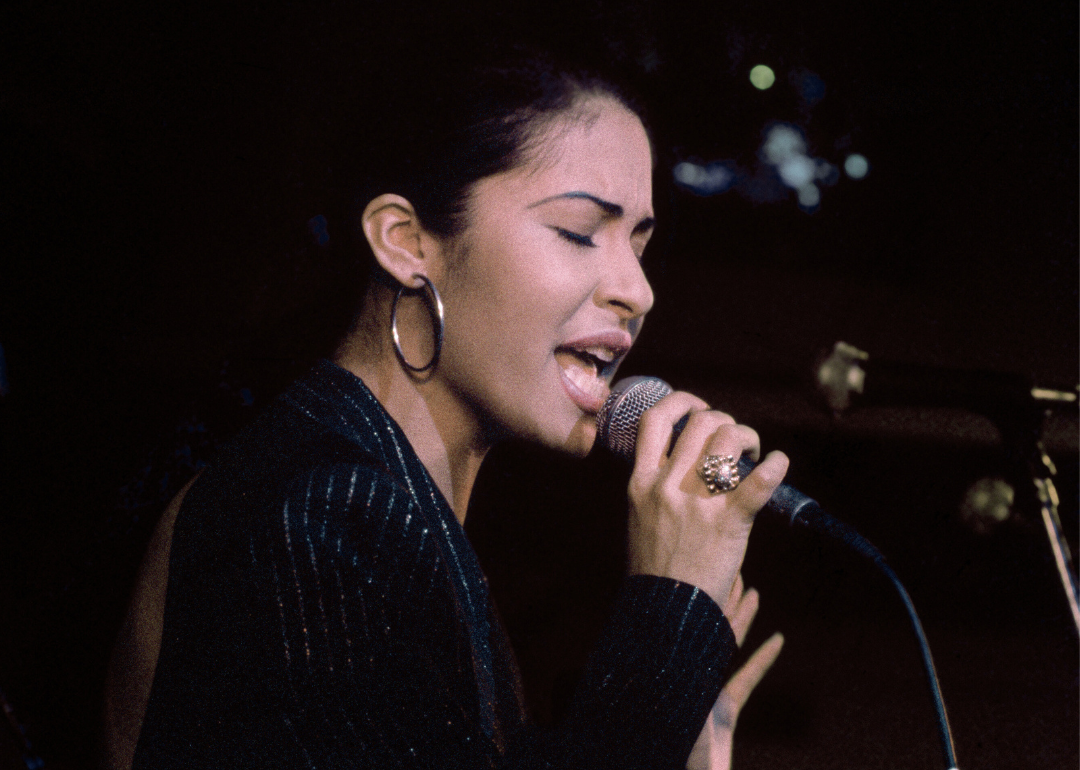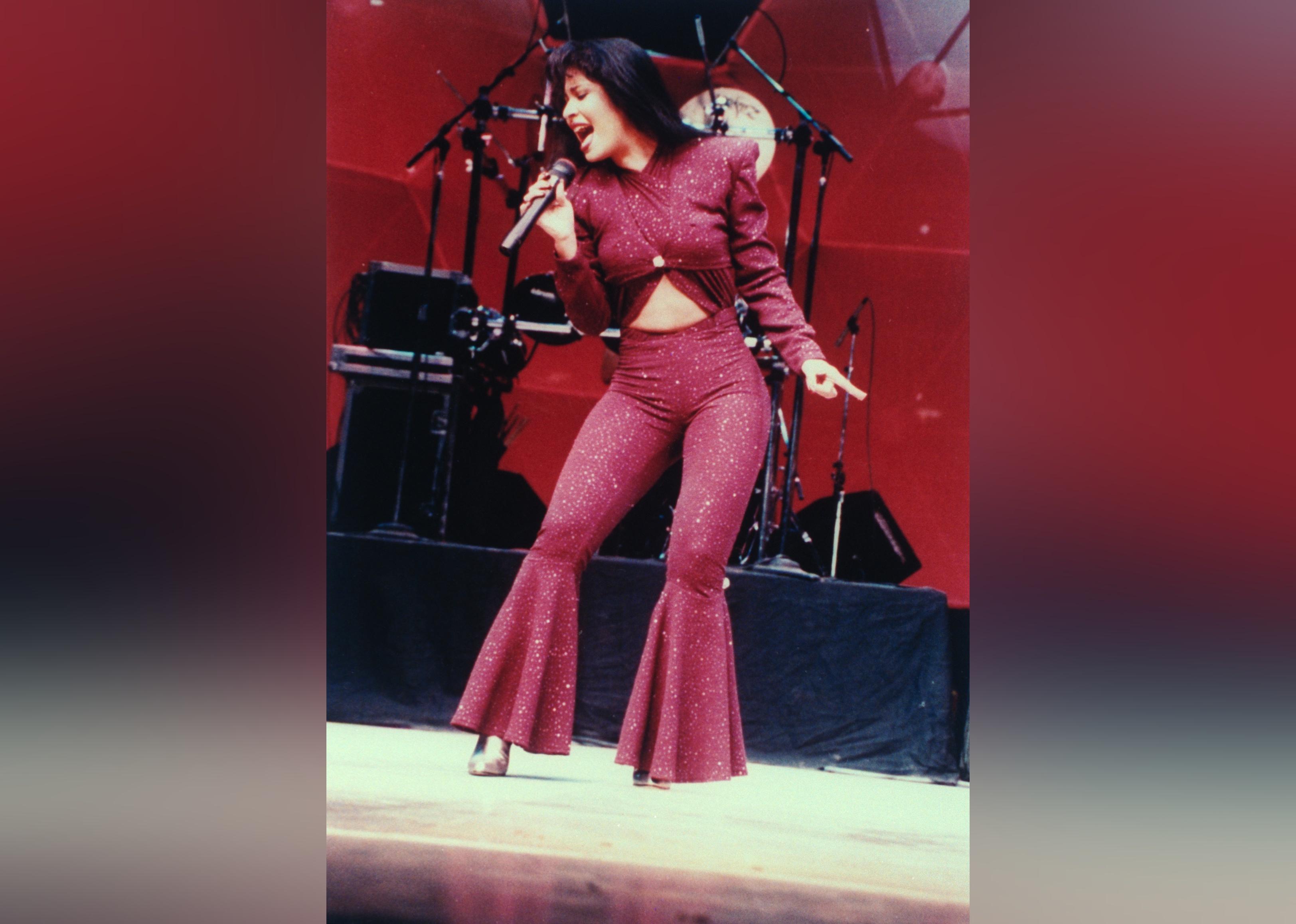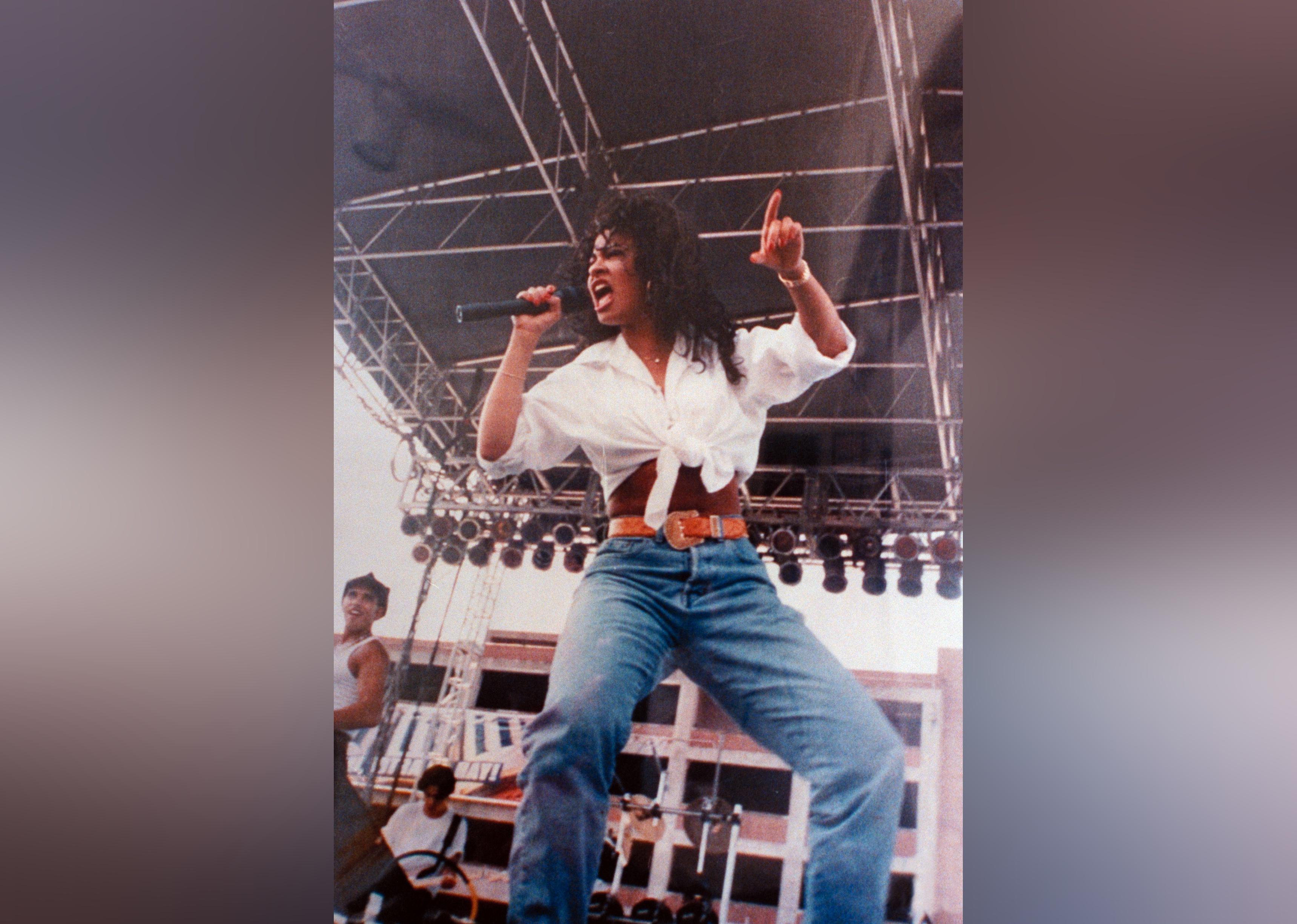 Tejano singer Selena singing into mike on outdoor stage.