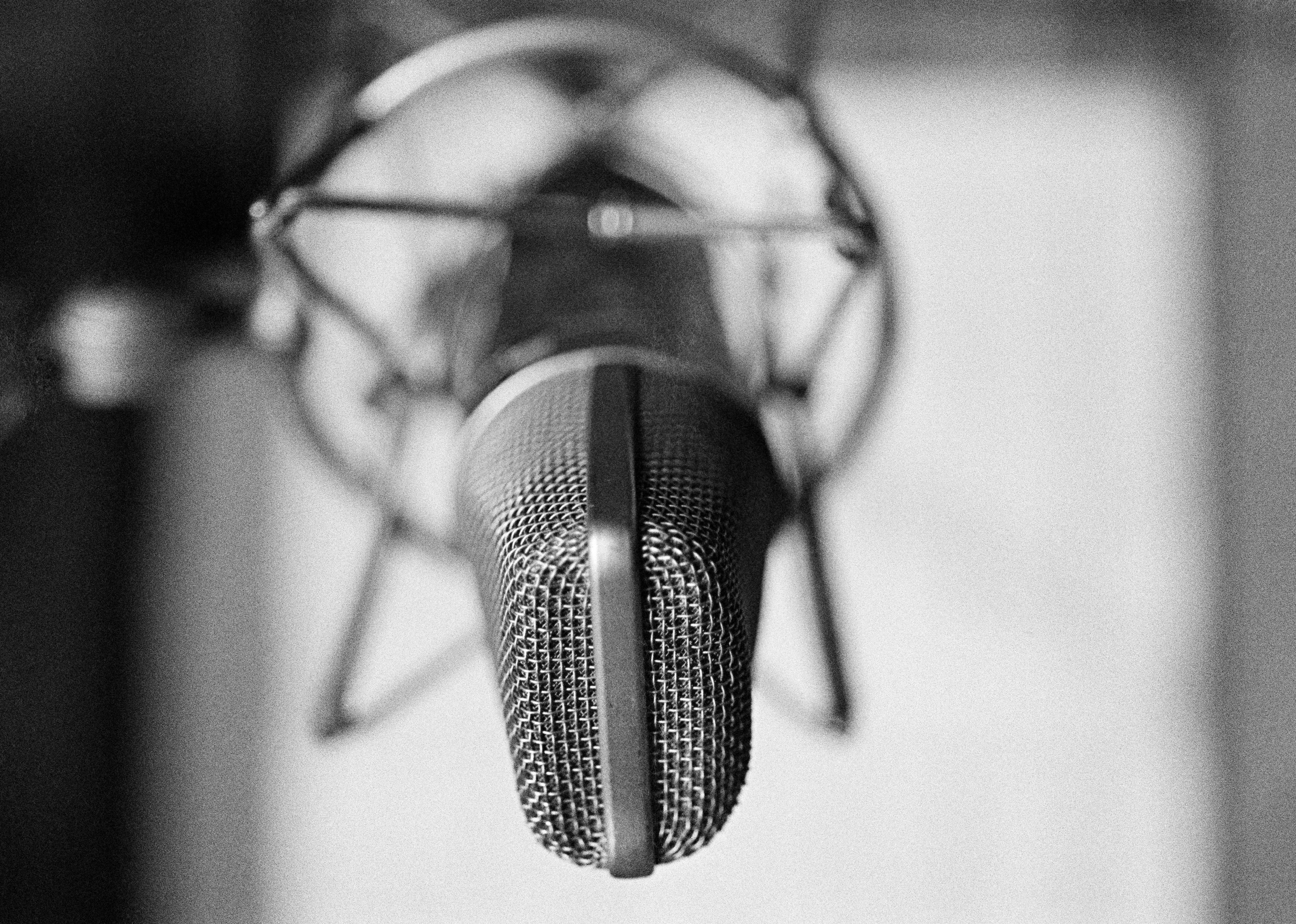 General view of a condenser microphone in a shock mount in a recording studio, circa 1980.