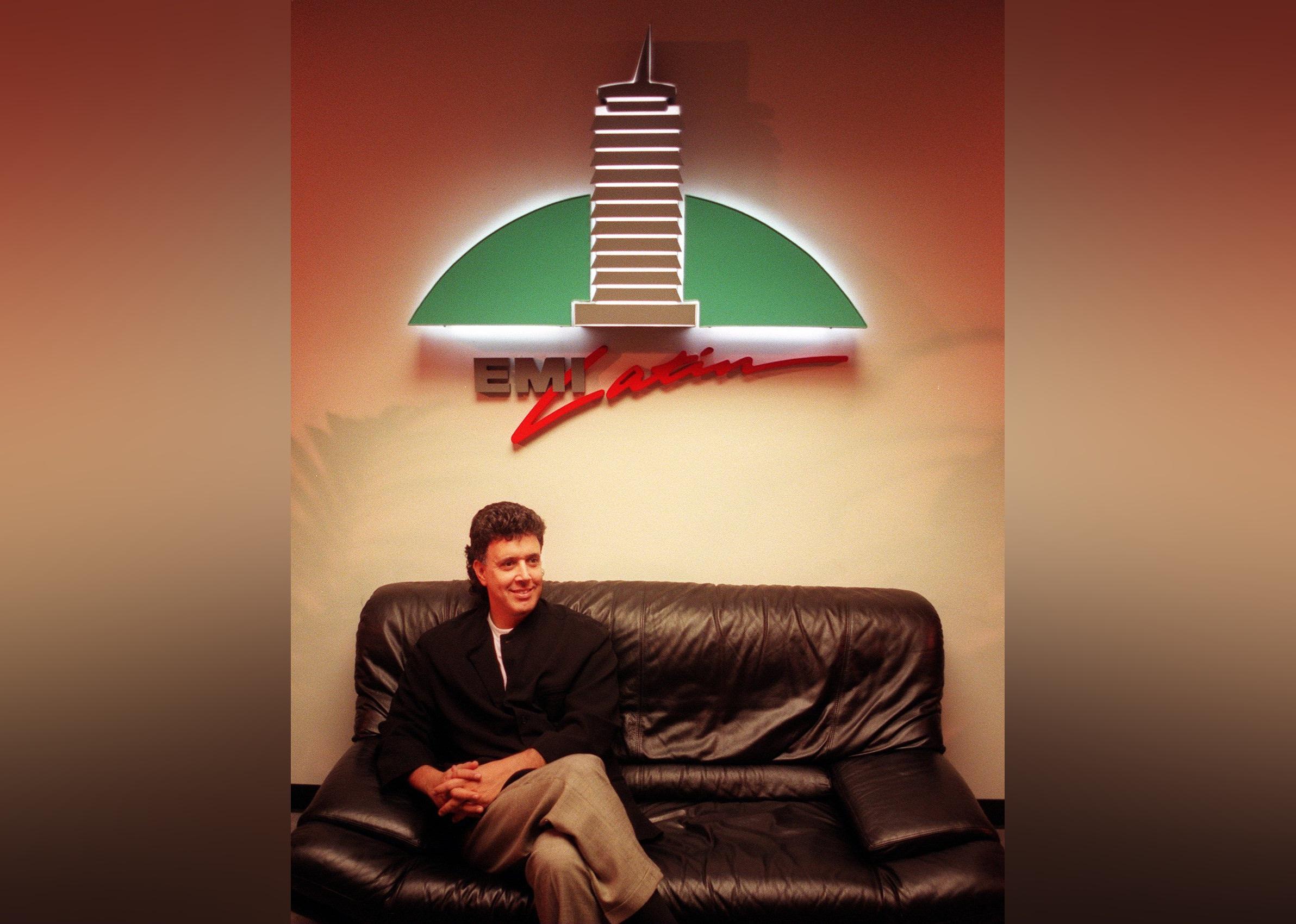 Jose Behar on a couch in front of a EMI Latin sign.