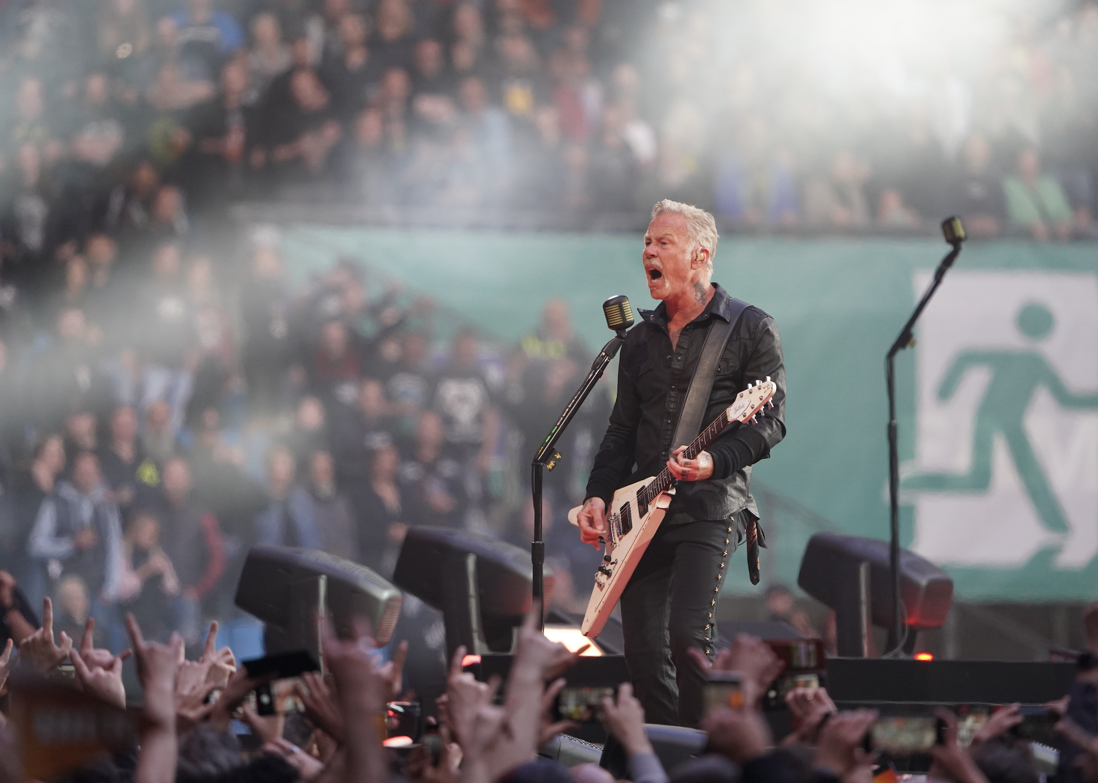 Singer James Hetfield of the band Metallica sings on stage at Volksparkstadion.