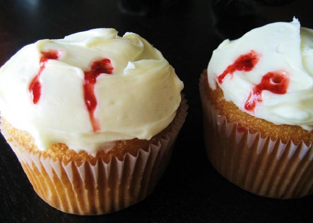 These vanilla cupcakes come with a nice bite of strawberry jam in the middle. Poke holes in the icing with a straw and pour the watered-down strawberry jam into the holes to create the illusion of blood dripping from a vampire’s bite. Use almond milk and vegan frosting for an egg- and dairy-free dessert that’s sure to scare.