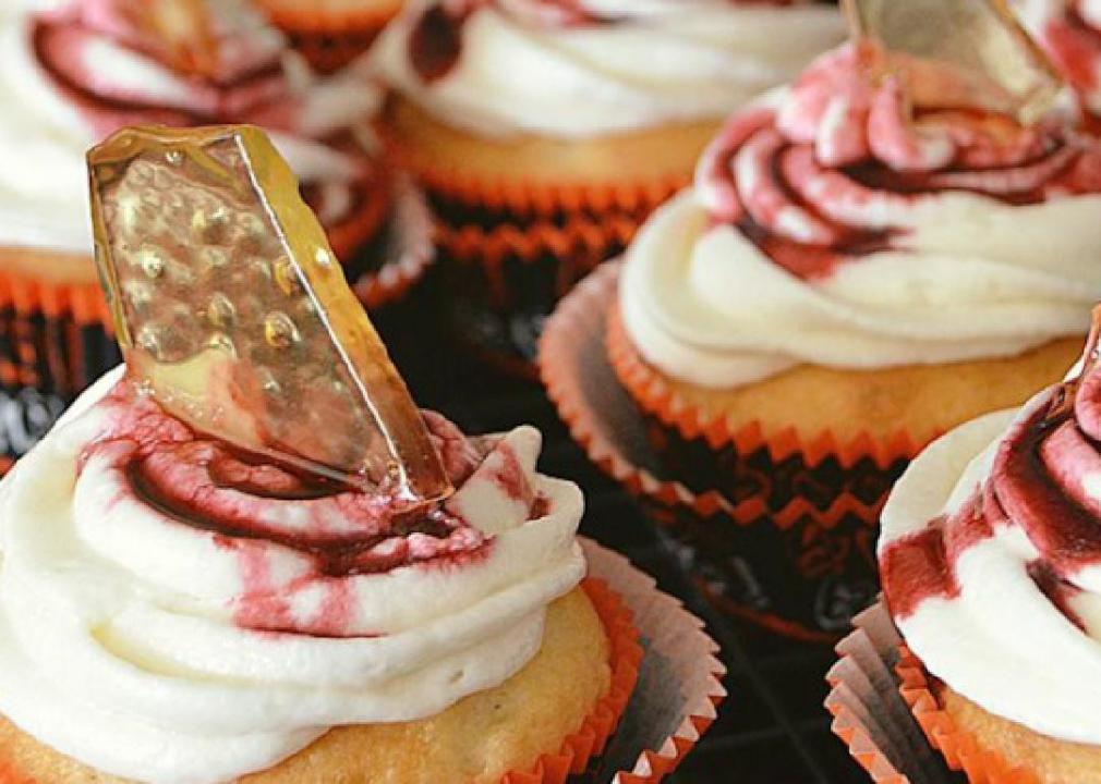 These cupcakes require a candy thermometer on hand to get the right consistency for the sugar glass topping. The water, corn syrup, sugar, and cream of tartar mix should hit 300 degrees before pouring it into a metal baking pan to cool. Some red and blue food coloring creates edible blood to top the cupcakes.