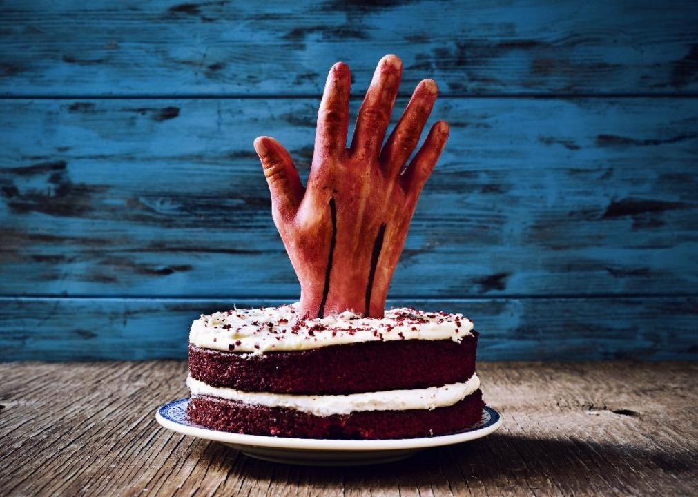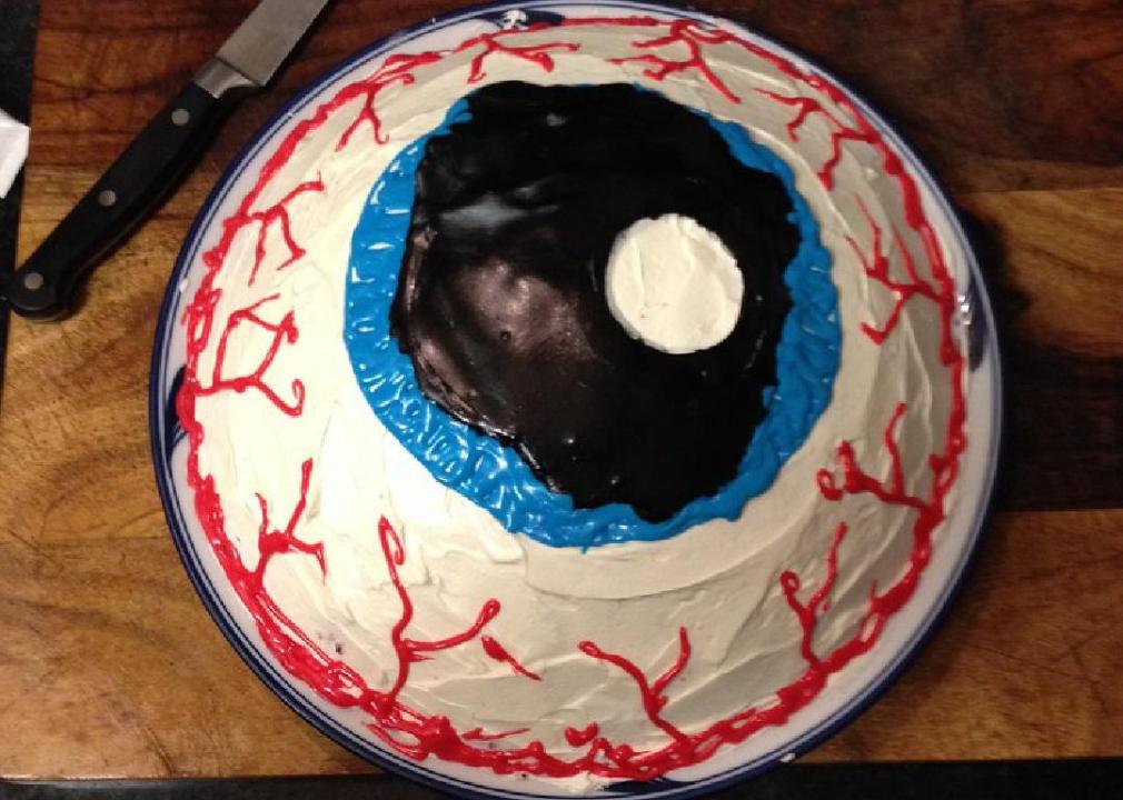 Creepiness jumps to a new level when someone cuts a piece and raspberry jam “blood” gushes out of this bundt cake. Soften blue taffy in the microwave and flatten with a rolling pin to create the iris of the eye, while doing the same to black candy gummies to form the pupil. Draw lines with red decorating gel for a bloodshot effect that will make people stare.
