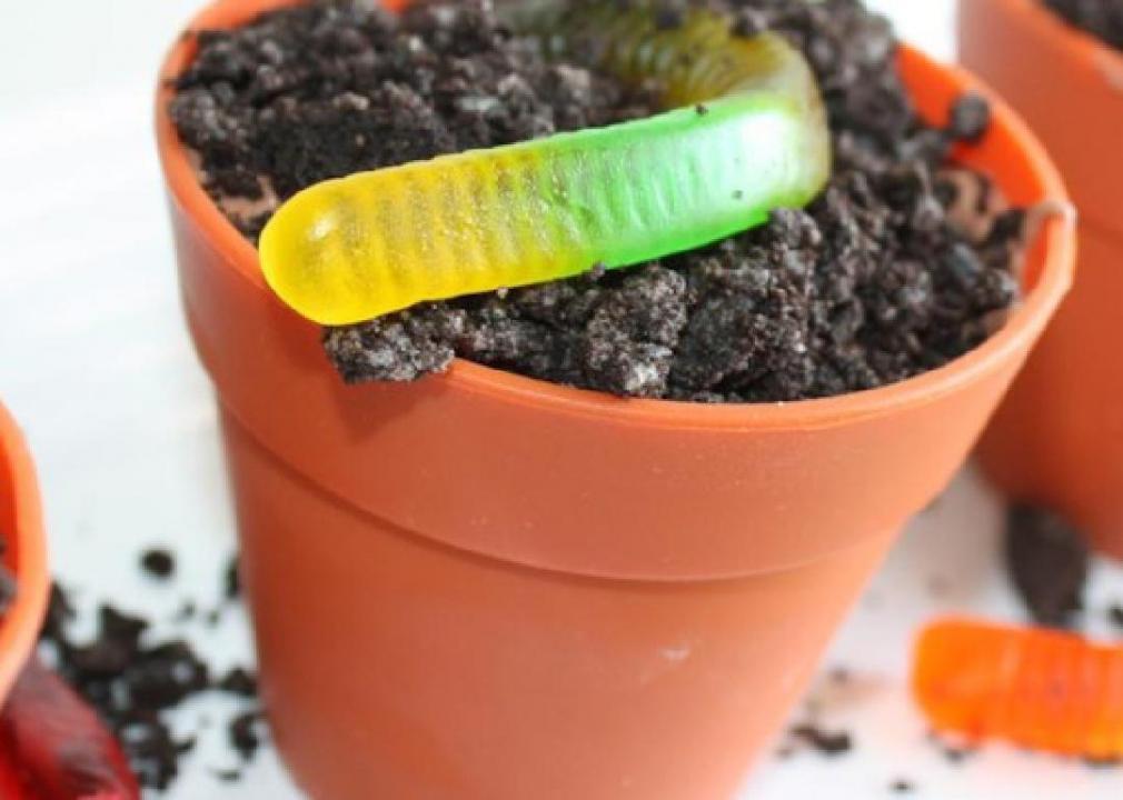 Serve this cold pudding dessert in a flower pot with a garden trowel for an added touch of reality, while gummy worms emerging from the sandwich cookie “dirt” completes this fun treat. For those who think the 800-plus calories per serving is too scary for their Halloween party, substitute lower-calorie cream cheese, whipped cream, and sandwich cookies.