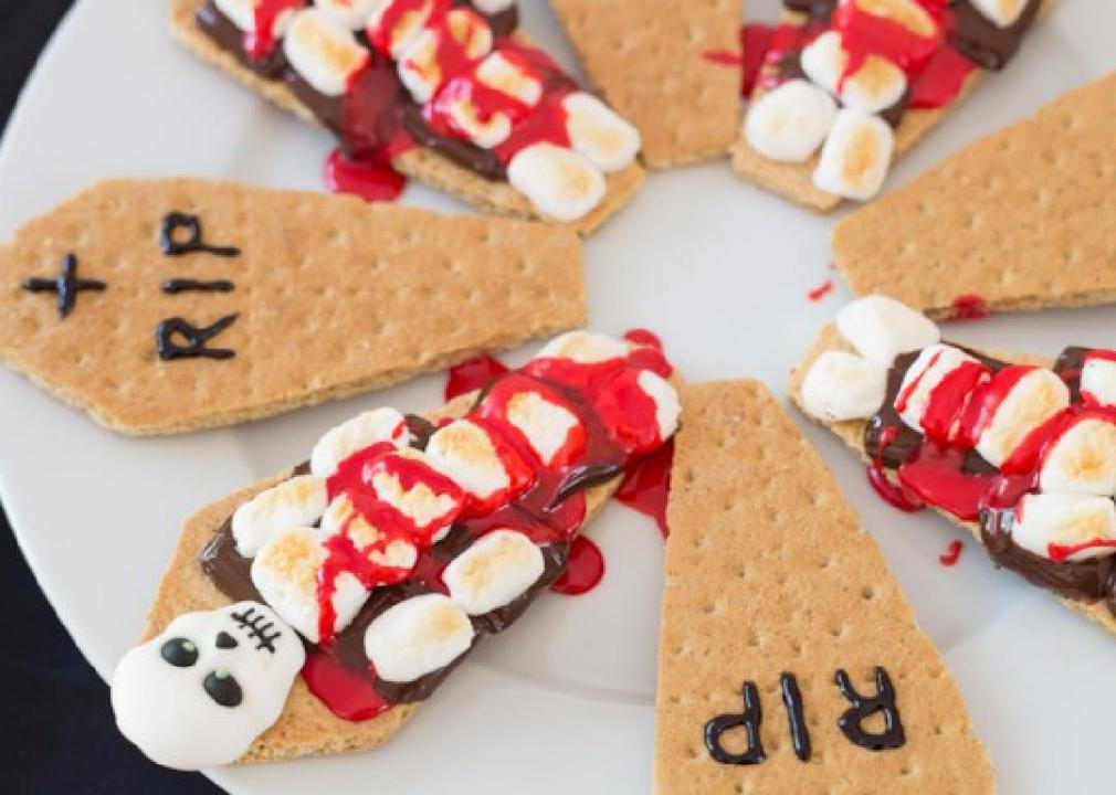 The graham cracker coffin encapsulates a marshmallow skeleton on a bed of chocolate to create the perfect s’more. Drizzle red icing over the top of the skeleton for a bloody, sugary punch. A 20-second stint in the broiler is all the cook time it takes before guests dig into these treats.