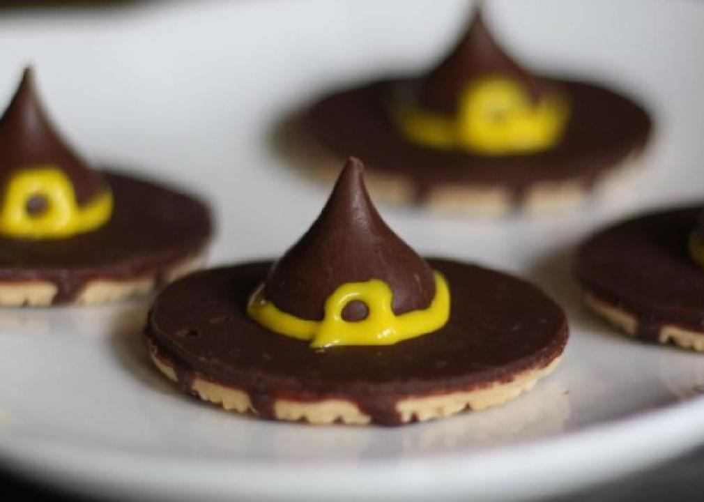 Of all the Halloween desserts on the list, this is the easiest one to make and requires very few ingredients. Simply place a fudge striped cookie upside down and stick a chocolate kiss to it with some honey. To add some flair to the hat, pipe any color frosting onto the rim in the traditional buckle shape.
