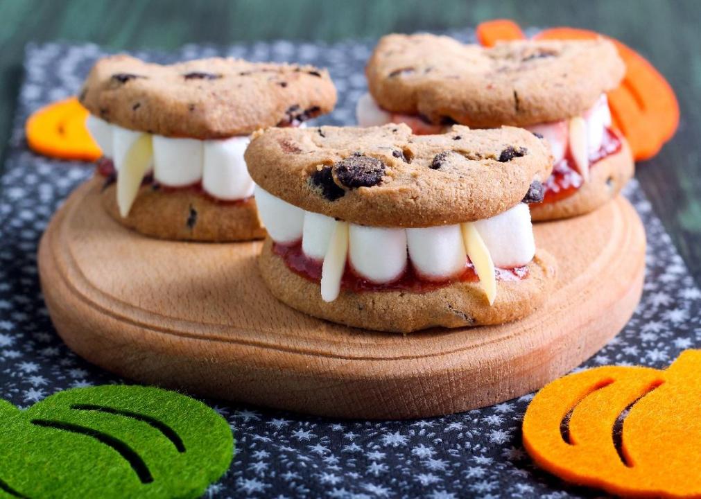 Just add some red food coloring to the vanilla frosting and spread across halved chocolate chip cookies to create this fairly simple Halloween dessert that’s sure to impress. Marshmallow teeth and almond slivers for fangs complete a treat for guests to sink their teeth into.