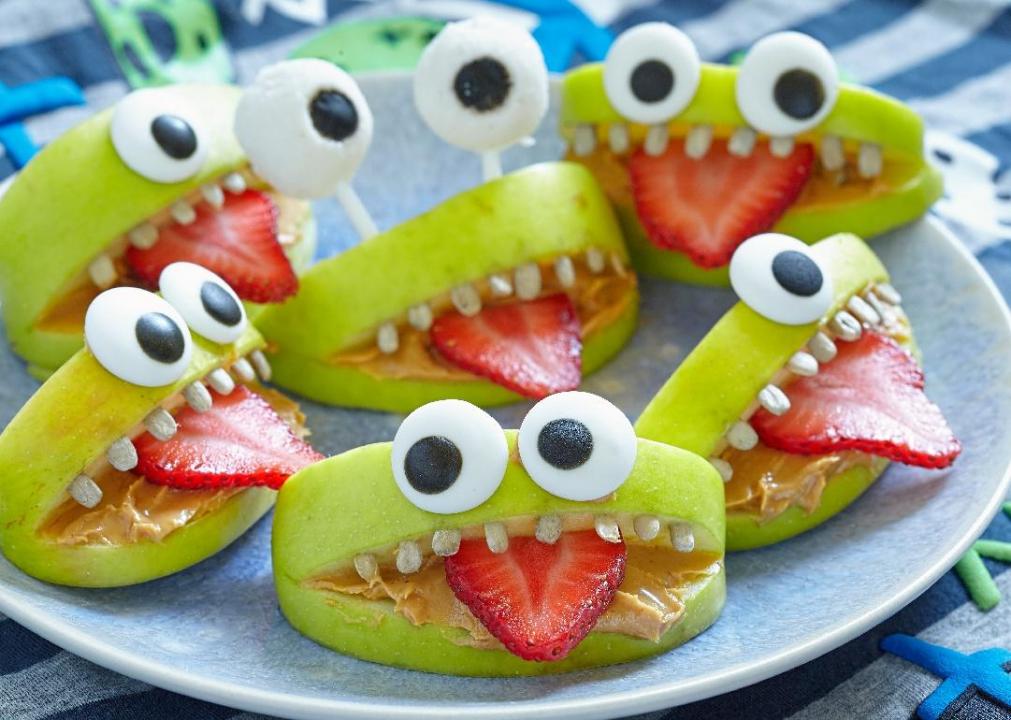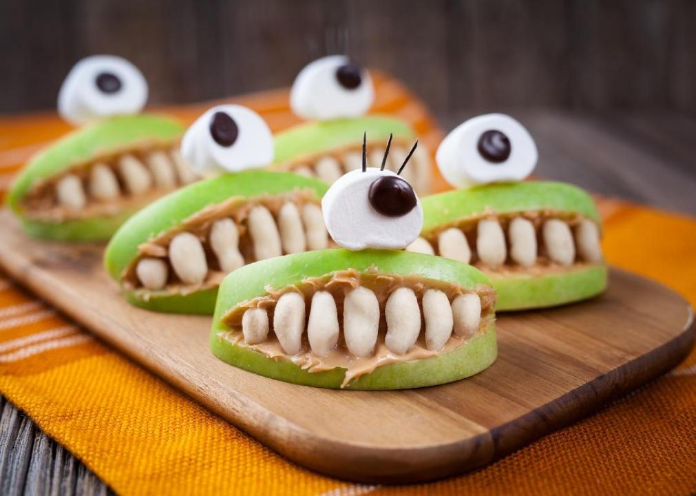 Three simple ingredients and less than 15 minutes go into making Monster Bites. Core and cut an apple into eight pieces, coat one side of each slice with peanut butter, and press candy corn into the peanut butter to act as teeth. Substitute candy corn for walnut for almond slivers to make this recipe even healthier.