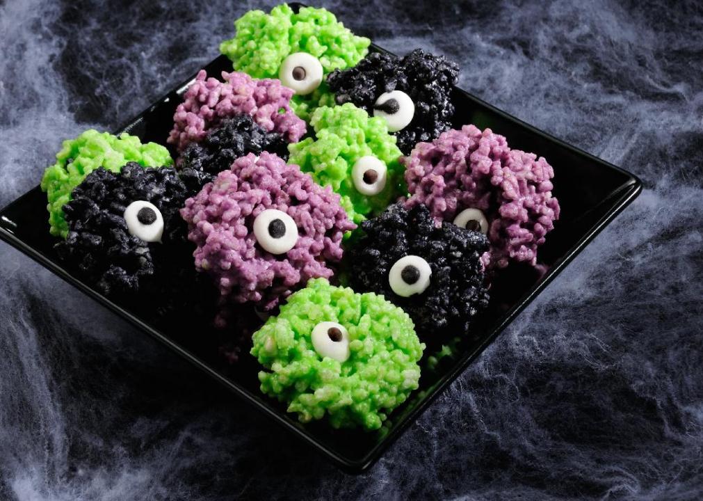 Rice Krispie treats are a simple-to-make, party favorite, with just butter and marshmallows needed along with the breakfast cereal. Use an ice cream scoop to form them into a ball and drop a dollop of melted green chocolate on one side. Finish with a candy eyeball and some sprinkles for a fun Halloween dessert.