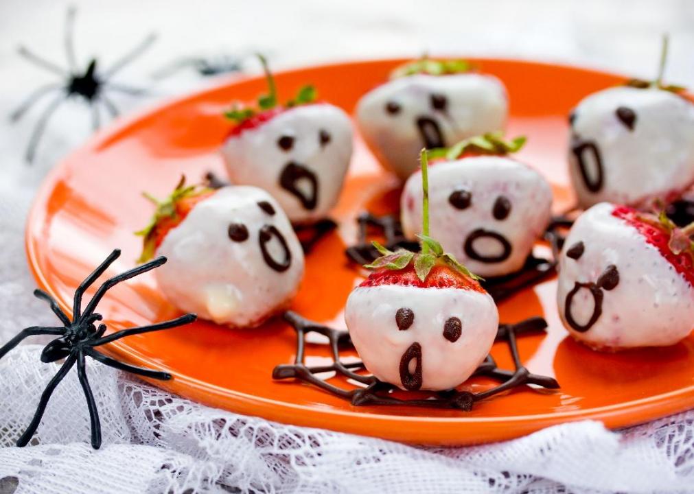 Chocolate-covered strawberries are always a party favorite and take less than 20 minutes to make, perfect for a last-minute dessert. Dip strawberries in melted white chocolate and set on parchment paper, dropping two mini chocolate chips near the top for eyes. Place them in the refrigerator for 10 minutes before piping different shaped mouths in dark chocolate. Another five minutes in the fridge, a ghastly sweet dessert is ready.