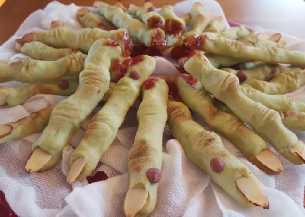 A little more than an hour is all it takes to make this great conversation piece. Guests may need a minute to get past the bloody reality of red decorating gel oozing from an almond fingernail, but once they do, a delicious treat awaits.