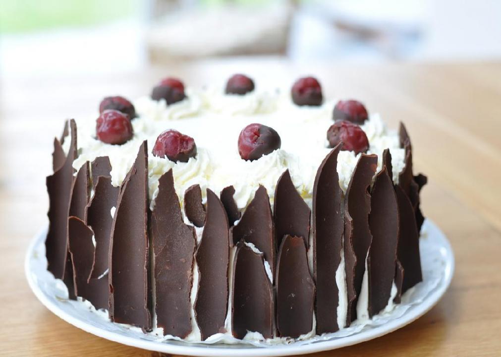 A chocolate and cherry cake surrounded by a forest of chocolate shards creates a decadent dessert. Smooth out melted chocolate between two layers of parchment paper, roll it up, refrigerate it, and unravel the cooled paper to create the chocolate shards. Black Forest Cake is named for a specialty liqueur in the Black Forest mountain range region of Germany.