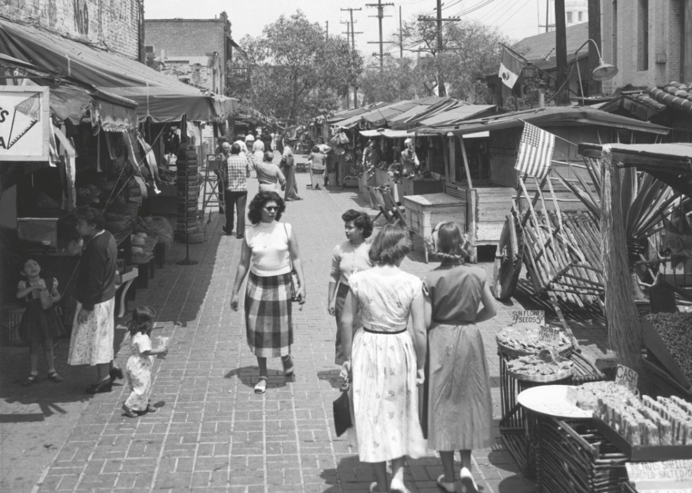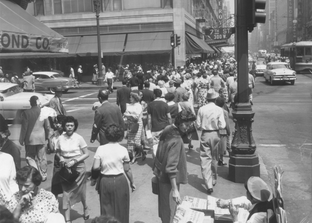 Hoards of Angelenos, their numbers ever-growing thanks to a 1950s population boom, cross 7th Street on a warm, sunny day.