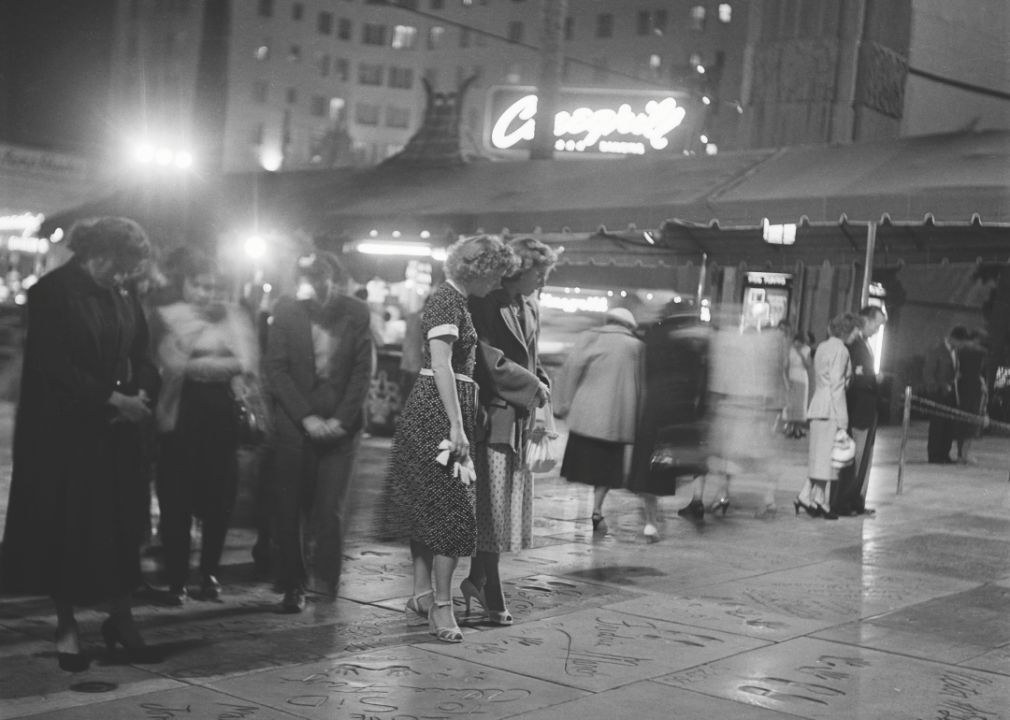 Two tourists pictured here stop to admire the concrete footprints in the courtyard of Grauman’s Chinese Theater. In the 1950s, more than two dozen major stars—including Elizabeth Taylor, John Wayne, and Marilyn Monroe—all added their hands and feet to the collection.
