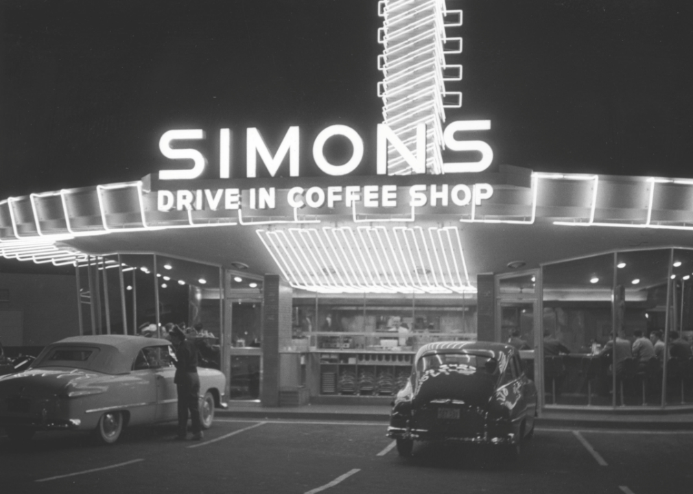 Drive-in restaurants were all the rage in the 1950s, and at one point Simon’s Coffee Shops dominated the LA drive-in scene. The restaurants, which offered everything from coffee to spaghetti, served patrons both outside in their cars and inside at the circular counters.